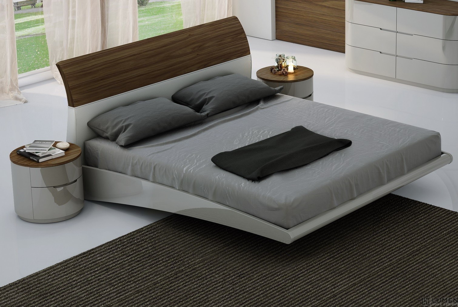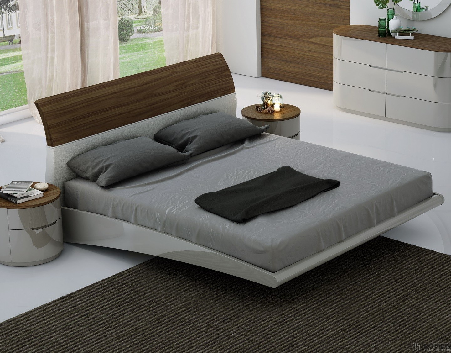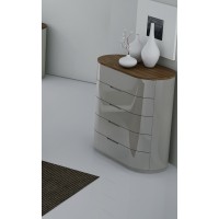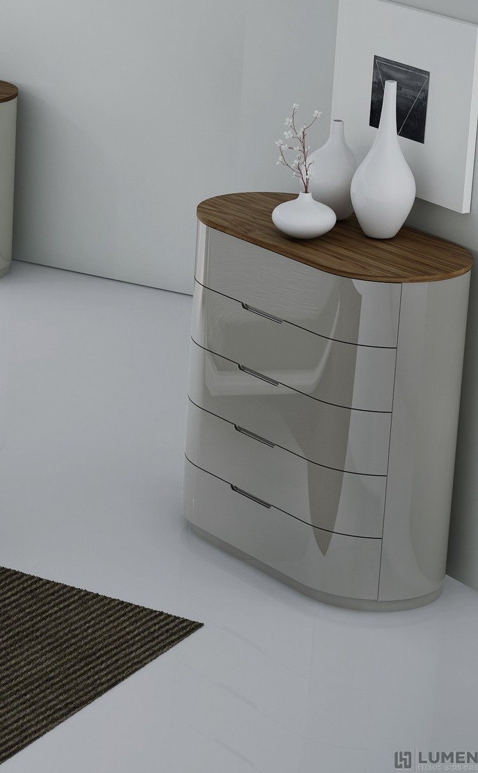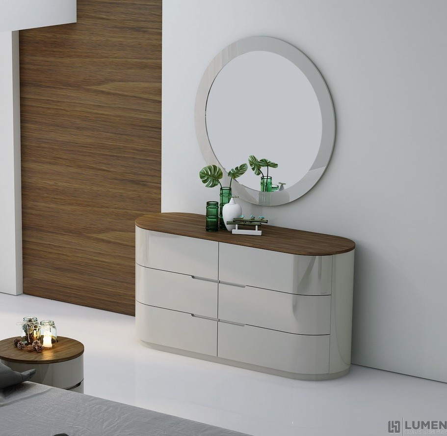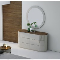 Short Description From our Prospect Bedroom set, the rounded shape of this dresser makes it kid friendly (no corners!) and visually interesting. Aside from its six ample drawers, its top comes covered in durable wood veneers for a modern look. The light grey lacquer contrasts beautifully against the brown to warm up any bedroom. All the furniture from our Prospect Bedroom set has been crafted using premium solid woods from Portugal and crisp grey lacquers. Matching bed, chest, mirror and nightstands are also available. Essentials about this piece: Expertly crafted using solid wood veneers and natural lacquers. Walnut wood top. Premium soft closing tracks. No assembly required. Color scheme: Grey, Walnut Wood, high gloss. Dimensions: 31" H x 60.5" L x 19.5" D. Other pieces in this set sold separately.