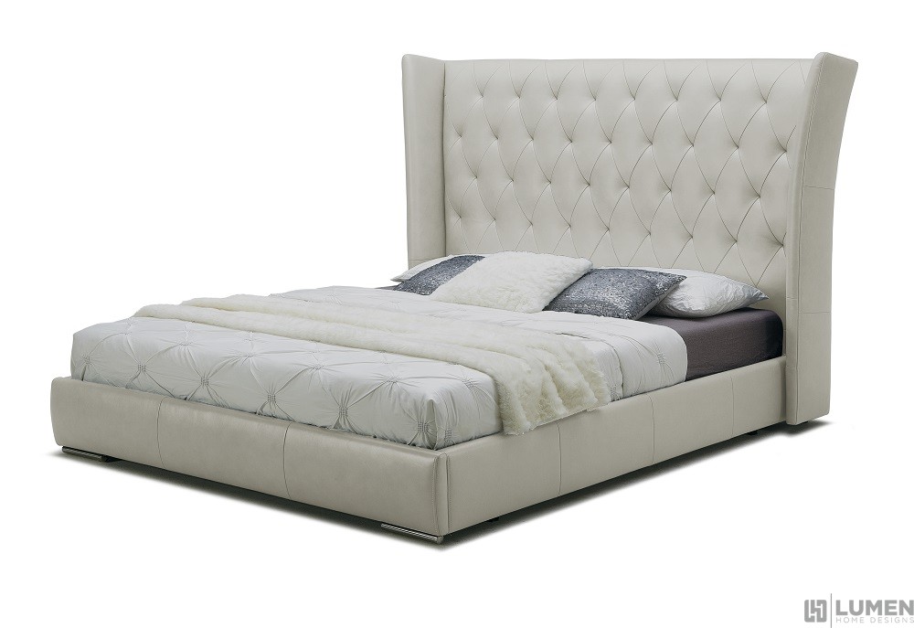 Short Description Featuring an extra wide and tall headboard with dimpled tufting, our Astoria Bed will become the centerpiece of your bedroom. It comes completely upholstered in plush premium leather for a luxe look and feel. Its gray finish will match perfectly with almost any color linens and other furniture. Pick your match: this bed comes in King and Queen size, both in either Light Grey or Grey upholstery. Essentials about this piece: Expertly upholstered in premium leather. Some assembly required. Protective bed feet. Color scheme: Light Grey or Grey. Dimensions: King - 59" H x 88" L x 91" D. Dimensions: Queen - 59" H x 75" L x 91" D. Other pieces sold separately.