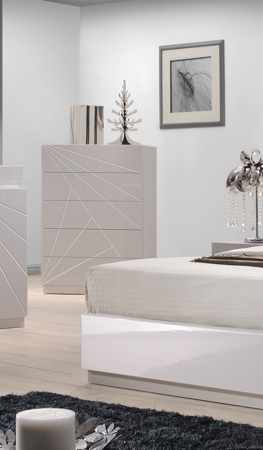 Short Description From our Carroll Bedroom set, this clean and casual dresser adds style and organization to any space. It features two separate storage settings: three ample drawers for clothes and accessories, plus a roomy vertical space for larger items like linens and coats. The front flap door comes embossed in white angular lines for a modern and elegant look. Our Carroll dresser has been expertly crafted using solid wood veneers and natural lacquers. Matching bed, chest and nightstands are also available. Essentials about this piece: Expertly crafted using solid wood veneers and natural lacquers. Premium soft closing tracks. No assembly required. Color scheme: White and Taupe. Dimensions: 36.2" H x 17.3" L x 53.5" D. Other pieces in this set sold separately.