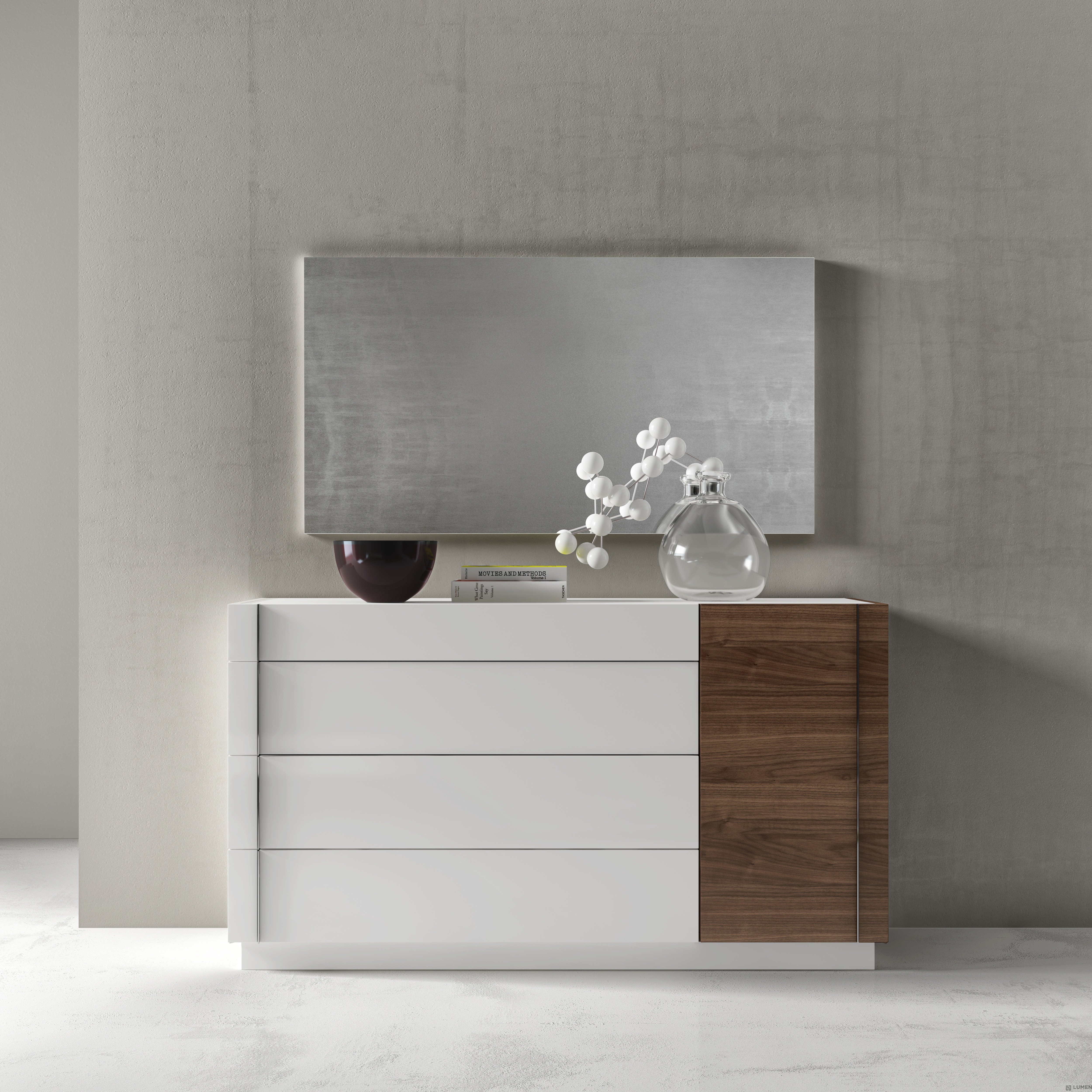 From our Sunset Bedroom set, this chest offers the best in minimalist style and function. It features multiple deep drawers with soft closing tracks, so you can discreetly stash away anything from clothes to toys. Sleek stainless steel hardware complete this look. As with the rest of our Sunset Set, this chest was handcrafted using premium solid woods and natural lacquers. Matching bed, dresser, mirror and nightstands are also available. Essentials about this piece: Expertly crafted using solid wood veneers and natural lacquers. Premium soft closing tracks. No assembly required. Color scheme: White, Beige and Walnut. Dimensions: 46.3" H x 17.8" L x 23.6" D. Other pieces in this set sold separately.