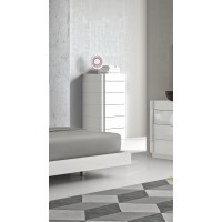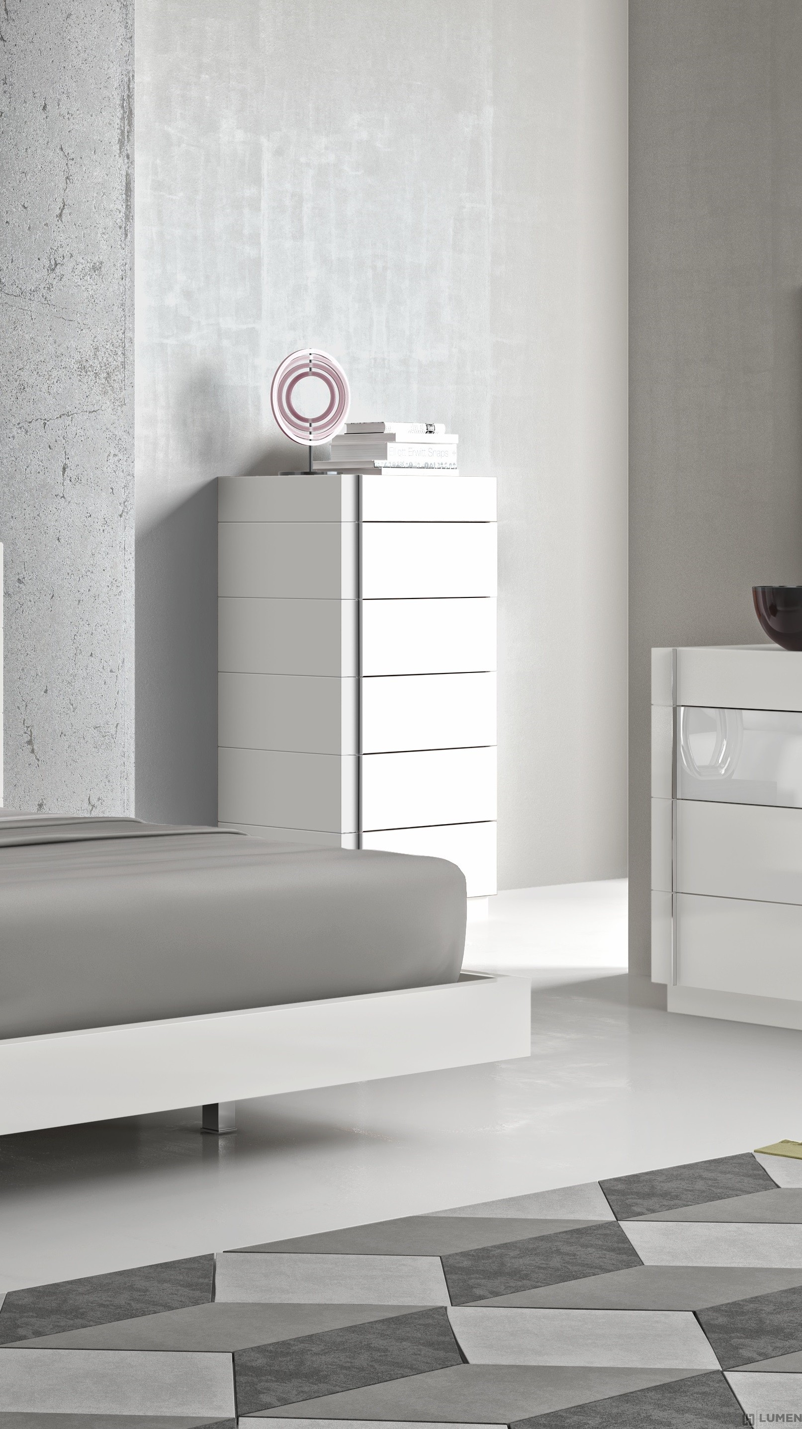 Short Description From our Sunset Bedroom set, this dresser features handsome storage and minimalist design. Its crisp white lacquer contrasts beautifully against warm wood veneers for a sophisticated edge. Additional to its four roomy drawers provide all the space you need for your linens, clothes and other essentials. Our Sunset dresser was handcrafted using imported solid woods and natural lacquers. Matching bed, chest, mirror and nightstands are also available. Essentials about this piece: Expertly crafted using solid wood veneers and natural lacquers. Premium soft closing tracks. Some assembly required. Color scheme: White, Beige and Walnut. Dimensions: 28.3" H x 17.9" L x 55.1" D. Other pieces in this set sold separately.
