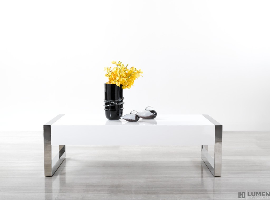 Short Description An ultra-chic white Coffee Table with high gloss finish and chrome-plated metal supports. Characterized with clean straight lines and rectangular symmetry, this stylish piece can perfectly accent any modern living area. Highly elegant standing on its own, yet sleek and straightforward to blend well with contemporary decor.