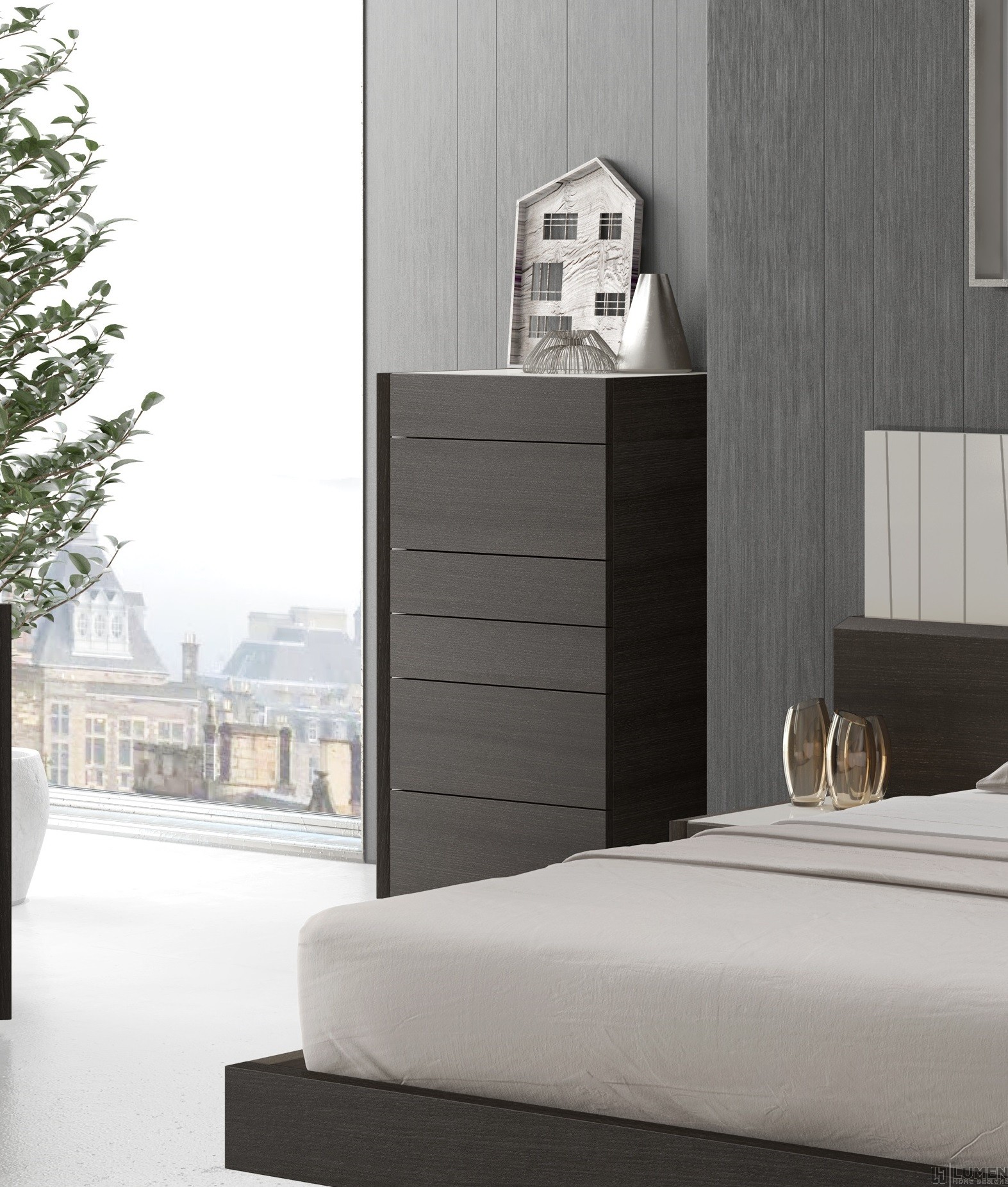Short Description From our Chatham Bedroom set, this dresser will provide the best storage solutions for your space. It features multiple drawers of different widths and heights, so you can better store smaller accessories and larger linens without leaving unused room. A contrasting grey lacquer finish adds visual interest to this piece. Our Chatham dresser was handcrafted using premium wood veneers with high gloss accents. Matching bed, chest, mirror and nightstands are also available. Essentials about this piece: Expertly crafted using solid wood veneers and natural lacquers. Tempered glass top. Stainless steel hardware. Premium soft closing tracks. Some assembly required. Dimensions: Light Grey and Wenge Brown. Dimensions: 28.3" H x 17.7" L x 55.1" D. Other pieces in this set sold separately.