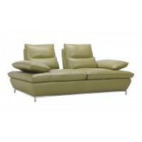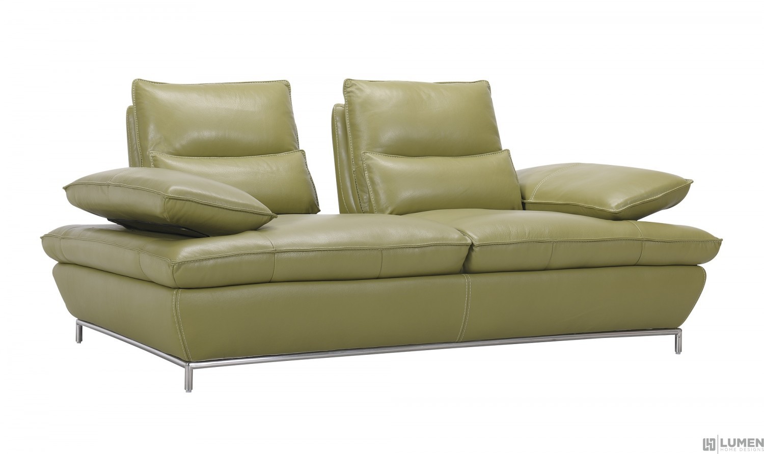 Short Description The Naomi sofa and loveseat is one of our newest editions and also one of our more  versatile and comfortable selections. Upholstered in a vivid olive green color, the Naomi  is 100% top grain Italian leather all around. Featuring adjustable back supports that extend  to allow for a laid back position in one swift motion. Added for comfort are stitched  in plush lumbar cushions. Naomi also comes with ultra soft adjustable arm rests with  multiple position capability and chromed stainless steel legs.Top Grain Full Leather, Goose Down Filling, Solid Wood Frame, Chromed Stainless Steel Legs