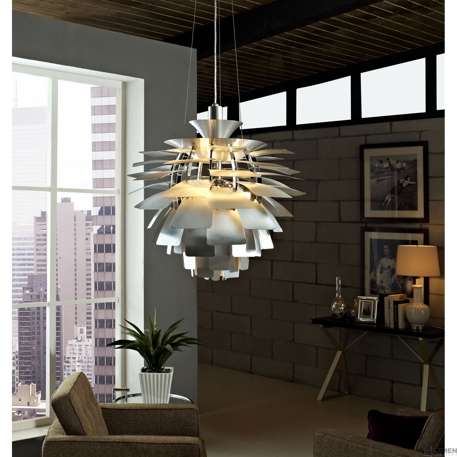 Short Description For home or commercial use Brushed aluminum petals Light source hidden at center Diffusion of light without glare Cords adjustable to varied lengths Takes 3 60 Watt Standard Light Bulb(Not Included) UL Listed and Approved
