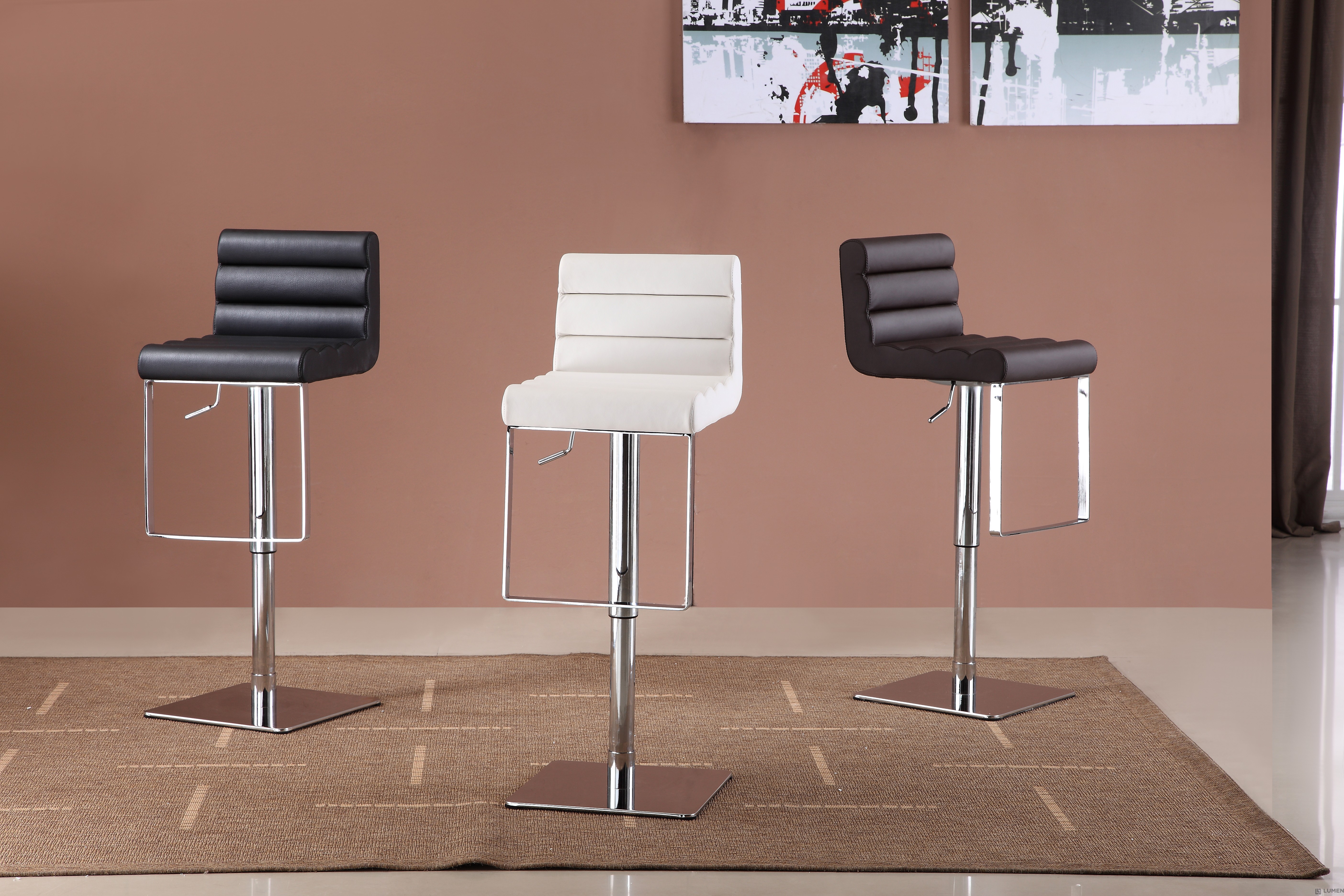 Short Description Bring the comfortable feel of your favorite lounge into your home bar with our padded bar stool. Expertly made using state of the art foam injection technology, it features a thickly padded ergonomic seat with full back coverage, and a strong stainless steel base plus footrest with a chrome finish. This classic chair is made to stand heavy duty use as all materials are waterproof, chemical proof, bacteria resistant and easy to clean. This polished bar stool will fit right in contemporary and classic spaces, whether for a kitchen home, bar or for commercial use. Mix and match: it's available in black, brown or white. Essentials about this piece: • Expertly made seat upholstered, molded foam. • Stainless steel base. • Pneumatic height adjustment, swivels. • Assembly not required. • Color scheme: Black, Brown or White. • Dimensions: 14.5” W x 16.5” D x 22-32” H.