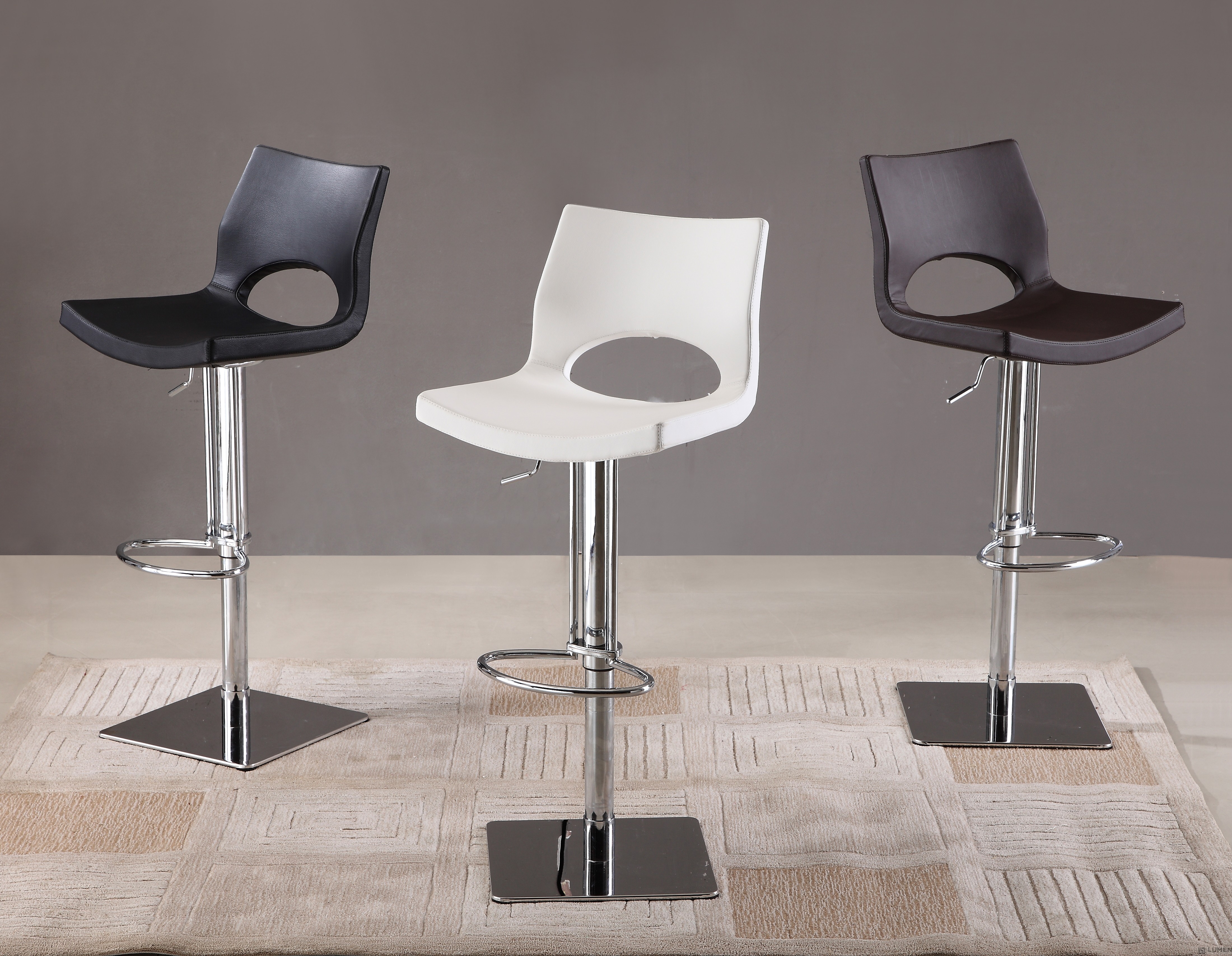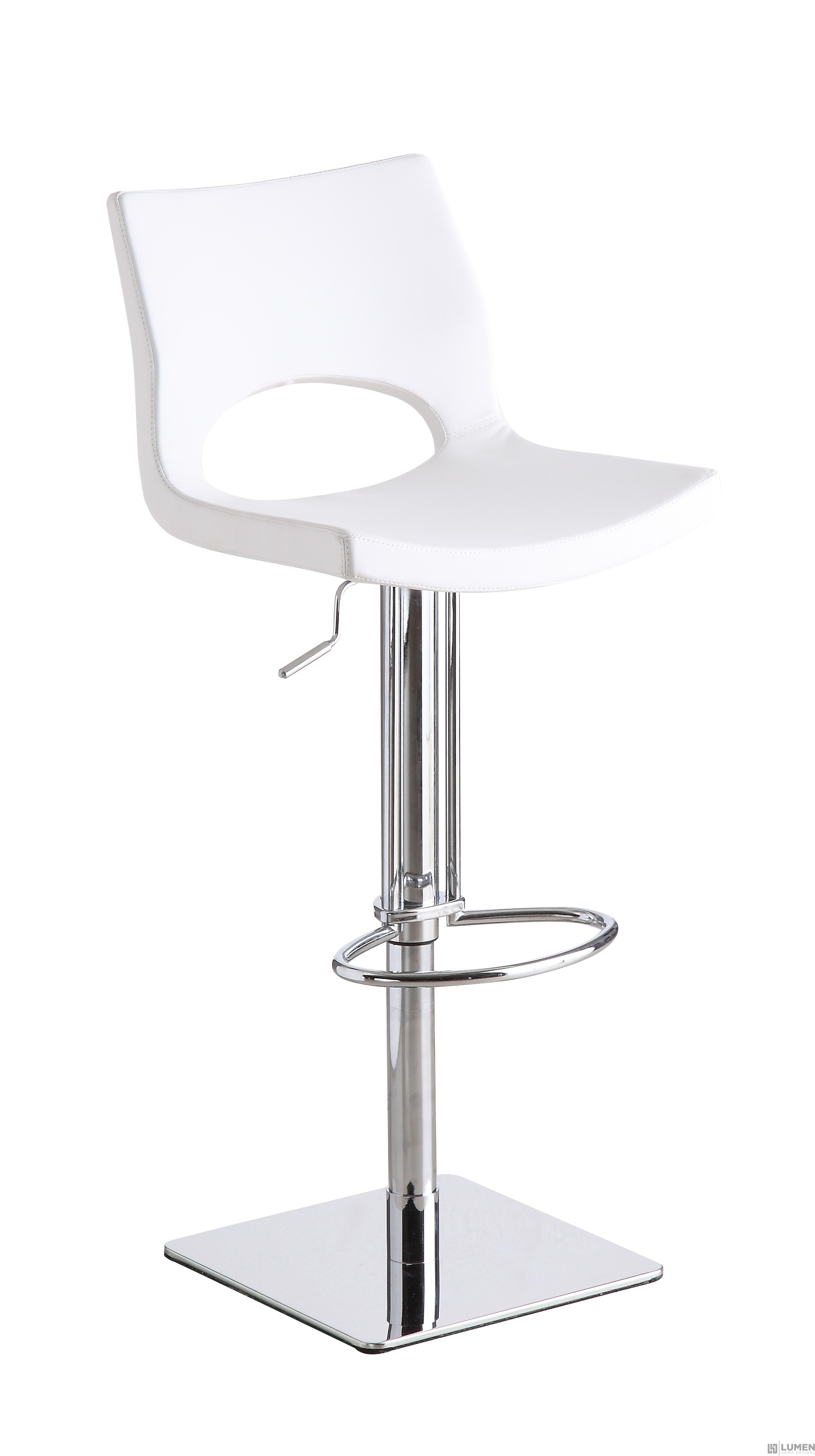 Short Description If you’re looking for a retro modern seating option to compliment your home or business, this edgy bar stool is for you! Done in leather with chrome plating, it is versatile and heavy traffic proof. As with all of our other foam based bar stools, this high chair is waterproof, bacteria resistant and chemical resistant. Its seat swivels to 360 degrees and features a hydraulic height adjustment mechanism. This funky bar stool will be the right accent for any contemporary or modern space, whether for a kitchen home, bar or for commercial use. Mix and match: it's available in black, brown or white leather. Essentials about this piece: • Foam injected seat cushion. • Stainless steel base. • Pneumatic height adjustment, swivels. • Assembly not required. • Color scheme: Black, Brown or White. • Dimensions: 17.5” W x 15.5” D x 23-33” H