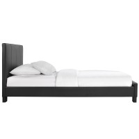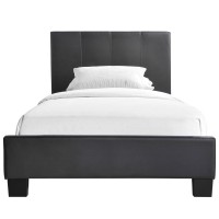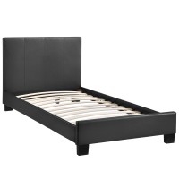 Short Description Contemporary bed frame Padded faux leather construction Detailed headboard stitching Wooden support slats Does not include a mattress Wipe clean with slightly damp cloth Black wooden legs