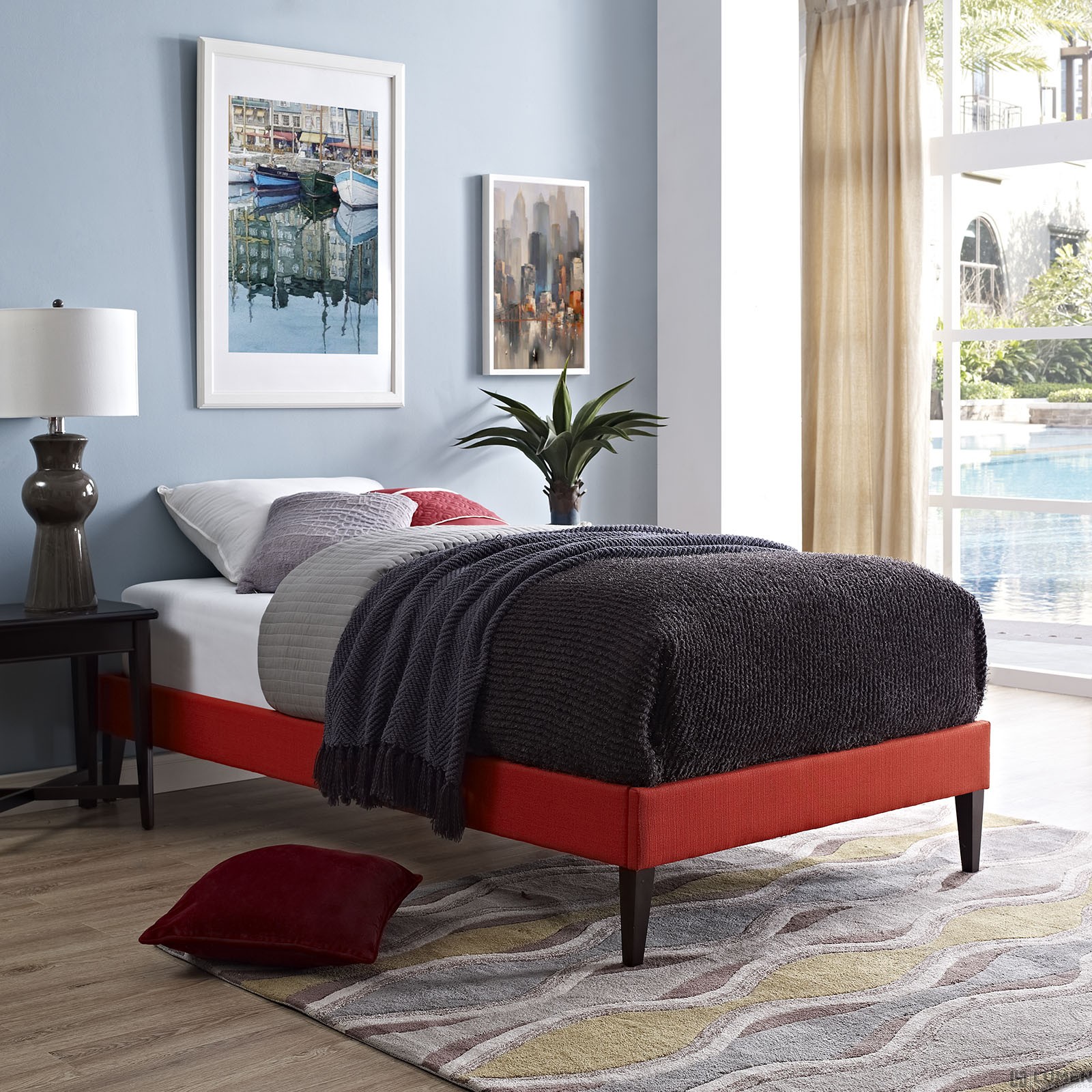 Solid Wood Frame Upholstered in Ten Wood Support Slats Polyester Center Rail with Support Two Legs Non-Marking Foot Glides Mattress not Included Assembly Required