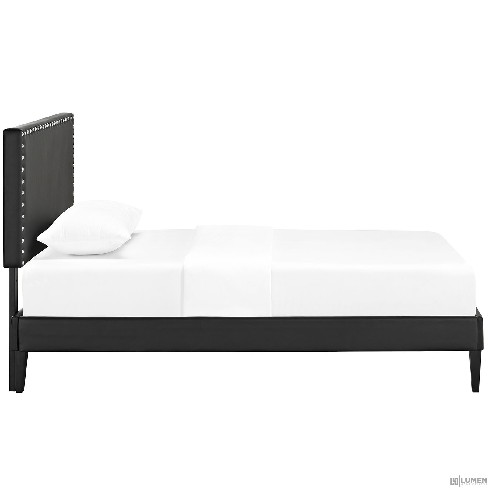 Short Description Fine Vinyl Upholstery Ten Wood Support Slats Wood Frame / Particleboard Panel Center Rail with Support Two Legs Mounts in Four Locations Dense Foam Padding Non-Marking Foot Glides
