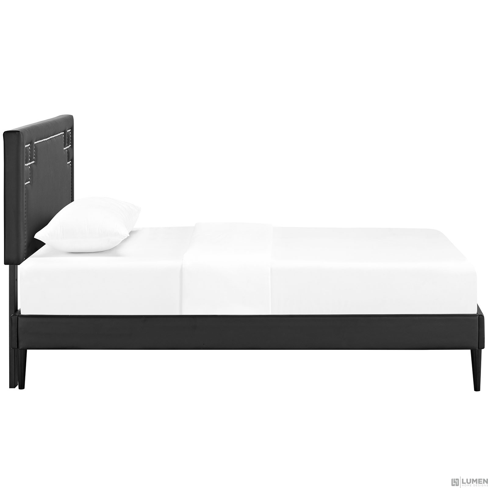 Short Description Fine Vinyl Upholstery Ten Wood Support Slats Wood Frame / Particleboard Panel Center Rail with Support Two Legs Mounts in Four Locations Dense Foam Padding Non-Marking Foot Glides