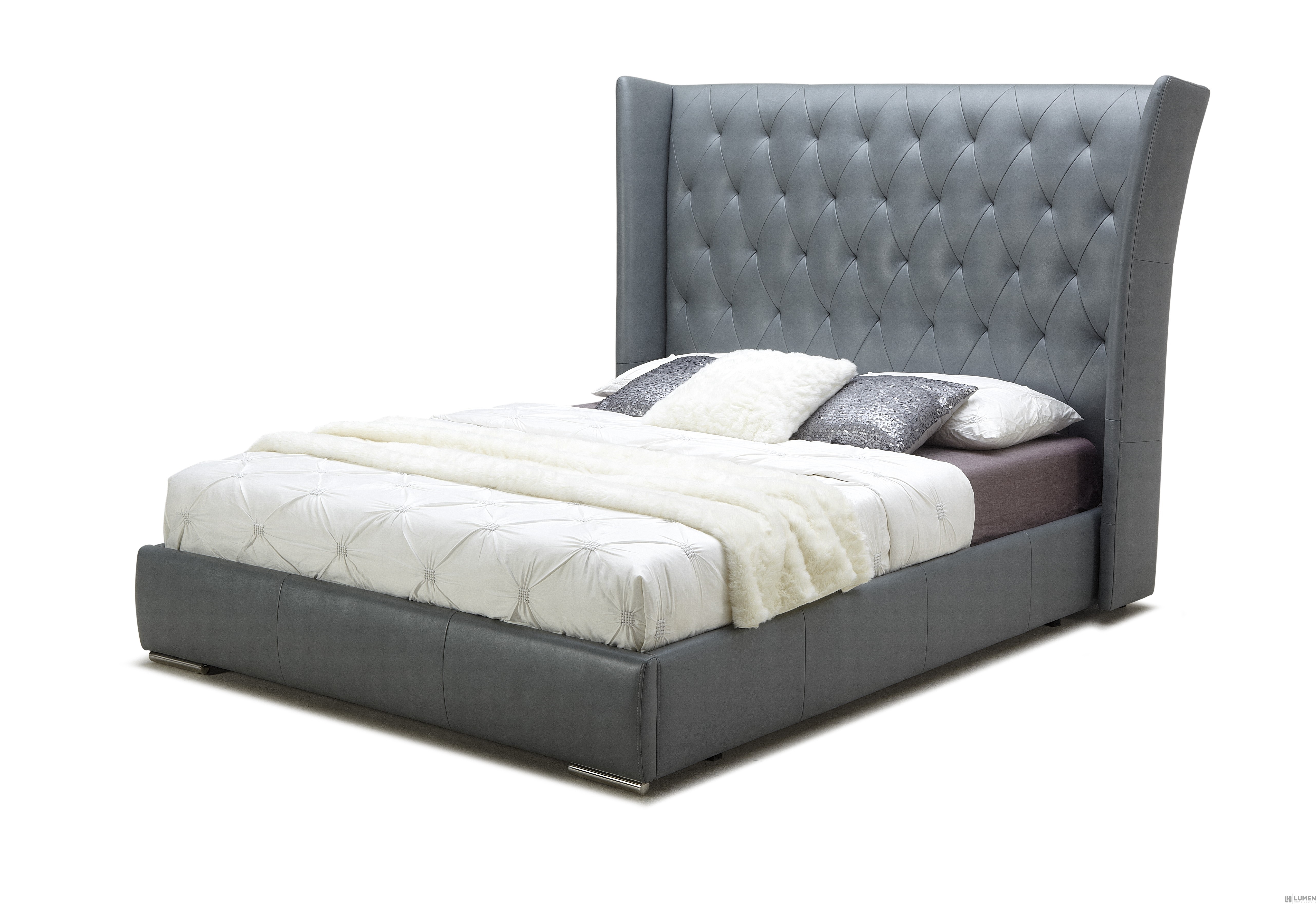 Short Description Featuring an extra wide and tall headboard with dimpled tufting, our Astoria Bed will become the centerpiece of your bedroom. It comes completely upholstered in plush premium leather for a luxe look and feel. Its gray finish will match perfectly with almost any color linens and other furniture. Pick your match: this bed comes in King and Queen size, both in either Light Grey or Grey upholstery. Essentials about this piece: Expertly upholstered in premium leather. Some assembly required. Protective bed feet. Color scheme: Light Grey or Grey. Dimensions: King - 59" H x 88" L x 91" D. Dimensions: Queen - 59" H x 75" L x 91" D. Other pieces sold separately.