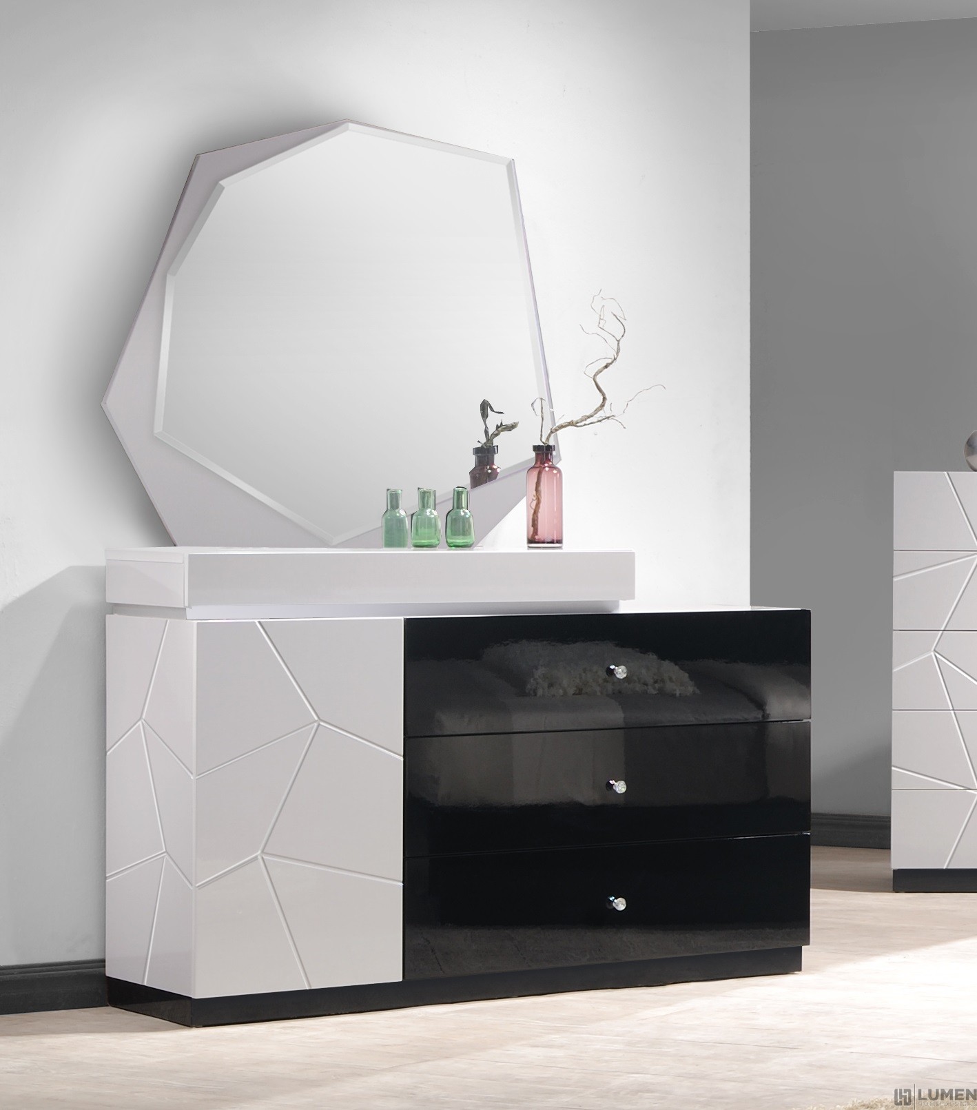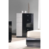 From our Brighton Bedroom set, this bold bed will become the centerpiece of your master bedroom. It features a strong wood platform base finished in sleek black, plus a contrasting headboard with black and white accents for a modern feel. Built in LED lights run throughout the headboard for an extra touch of drama. Our Brighton bed has been crafted using high quality wood veneers, authentic leather and natural lacquers. Take your pick: it comes in both King and Queen size. Matching dresser, chest and nightstands are also available. Essentials about this piece: Expertly crafted using solid wood veneers and authentic leather. Headboard with built in LED lights. Some assembly required. Color scheme: Light Grey and Black, high gloss. Dimensions: King - 45.3" H x 94" L x 82.3" D. Dimensions: Queen - 45.3" H x 78"L x 82.3" D. Other pieces in this set sold separately.