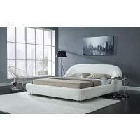 Lumen Home Designs proudly introduces the Mia bed. It is available in either queen or king  size. Mia features a rounded and sloped headboard with accentuated stitching and  upholstered in a rich plush white colored Eco-Leather. Mia sits low and is held up by  elegant and shiny stainless steel legs.Eco-leather, Solid Wood Frame, High Density Foam, Chromed Stainless Steel Legs