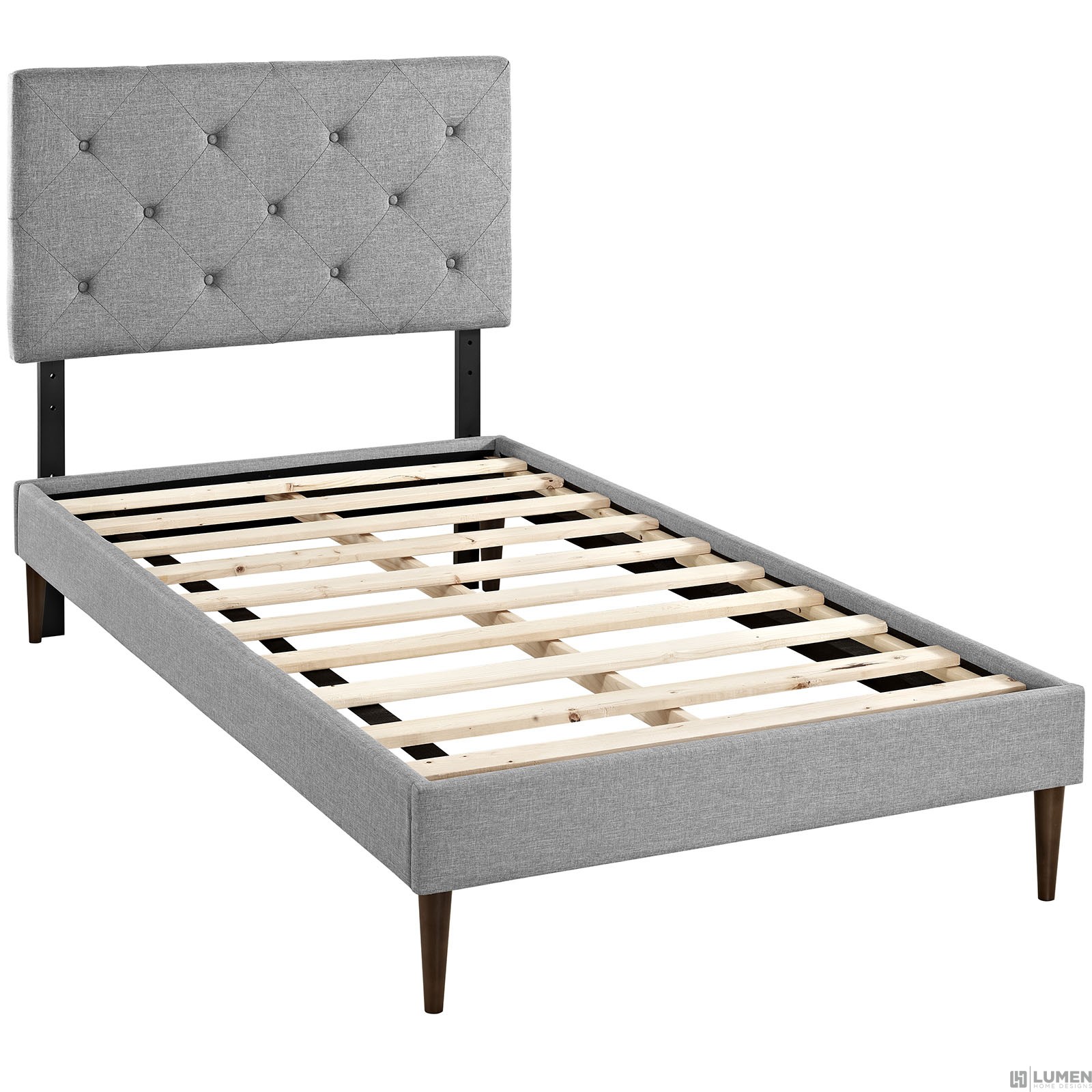 Short Description Fine Polyester Upholstery Ten Wood Support Slats Wood Frame / Particleboard Panel Center Rail with Support Two Legs Mounts in Four Locations Dense Foam Padding Non-Marking Foot Glides