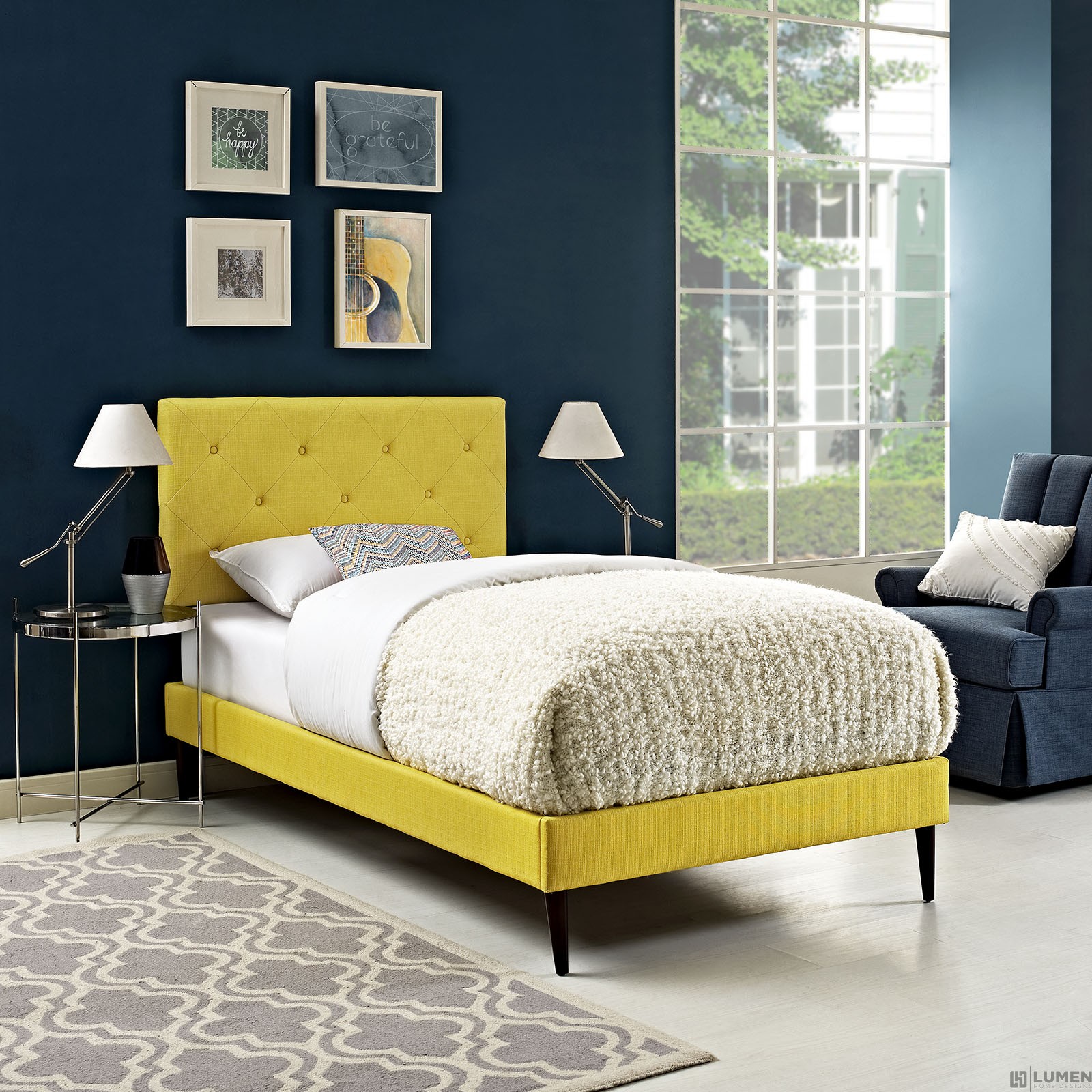Short Description Fine Polyester Upholstery Ten Wood Support Slats Wood Frame / Particleboard Panel Center Rail with Support Two Legs Mounts in Four Locations Dense Foam Padding Non-Marking Foot Glides