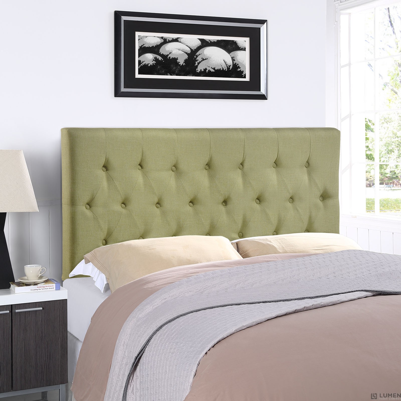 Contemporary Headboard Elegant deep tufted buttons Fine linen upholstering Fiberboard and solid wood frame Mounts in 4 Locations