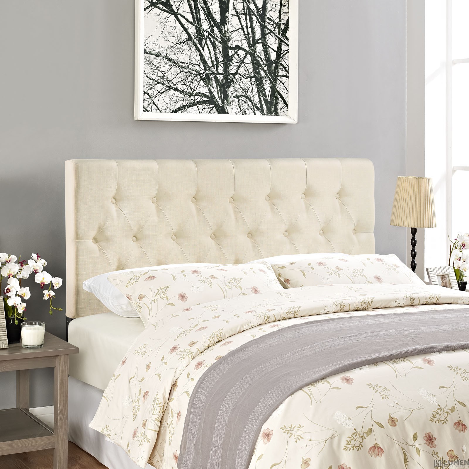 Short Description Contemporary Headboard Elegant deep tufted buttons Fine linen upholstering Mounts in 4 Locations Fiberboard and solid wood frame