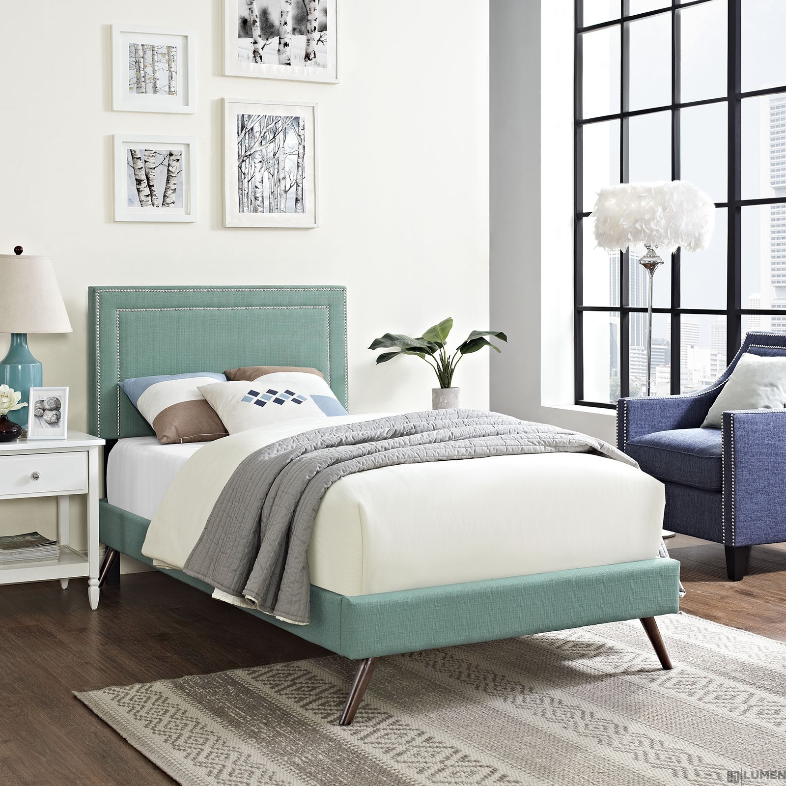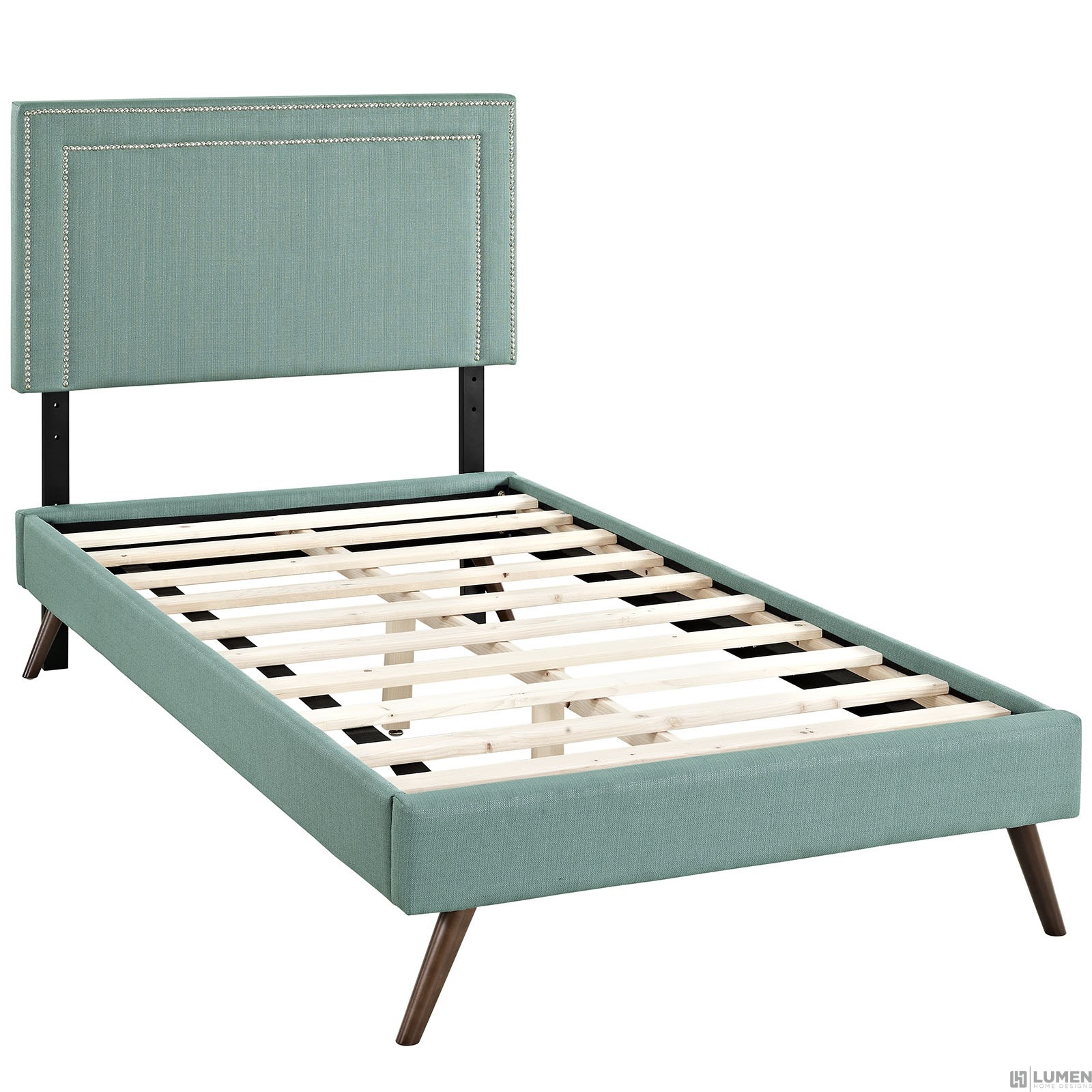 Short Description Fine Polyester Upholstery Ten Wood Support Slats Wood Frame / Particleboard Panel Center Rail with Support Two Legs Mounts in Four Locations Dense Foam Padding Non-Marking Foot Glides