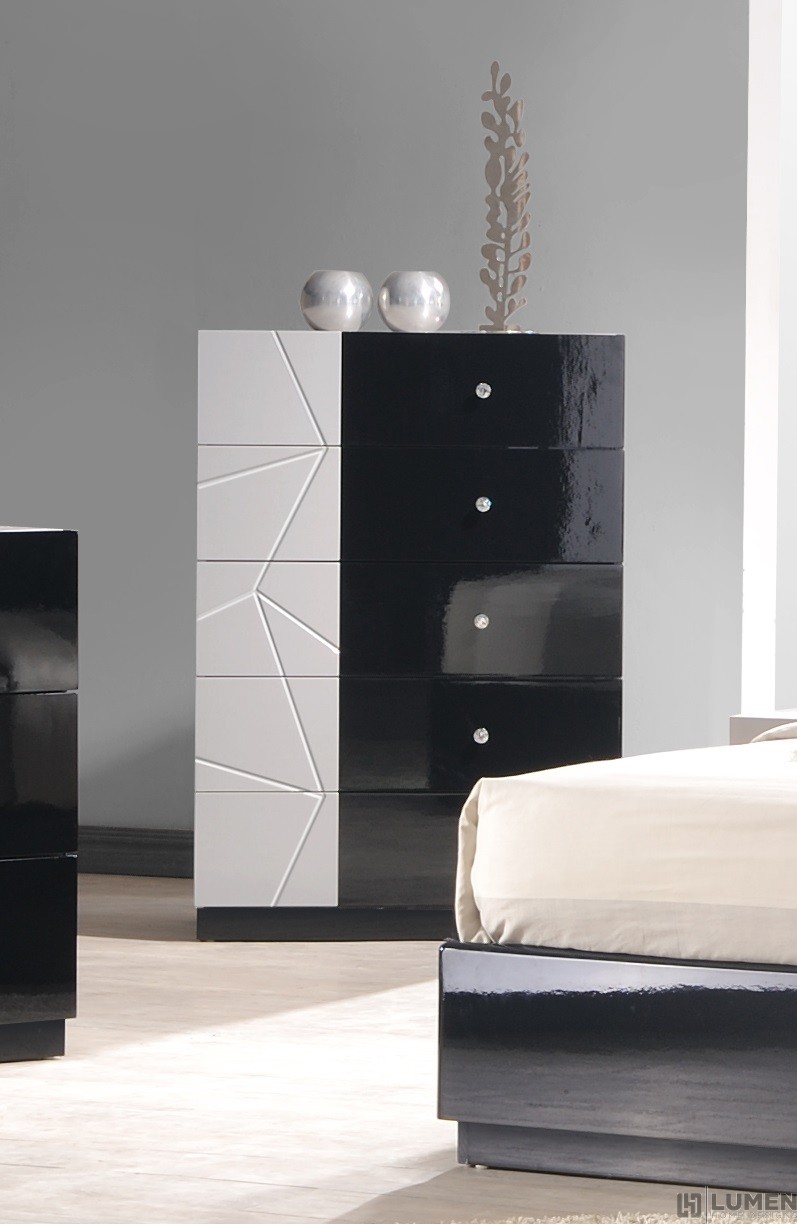 Short Description From our Brighton Bedroom set, this elaborate chest will add a touch of sleek elegance to your bedroom. It's five roomy drawers come finished in contrasting black and white lacquer, plus intricate geometric patterns for a modern feel. Delicate stainless steel knobs complete this look. As with the rest of our Brighton Set, this chest was handcrafted using premium solid woods and natural lacquers. Matching bed, dresser and nightstands are also available. Essentials about this piece: Expertly crafted using solid wood veneers and natural lacquers. Stainless steel hardware. Premium soft closing tracks. No assembly required. Color scheme: Light Grey and Black, high gloss. Dimensions: 43" H x 19.3" L x 30.1" D. Other pieces in this set sold separately.