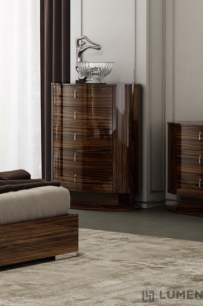 Short Description From our Bogart Bedroom set, this sophisticated nightstand also brings ample storage to your bedside. It comes with two roomy drawers plus an ample tabletop to store all of your nighttime essentials. This piece features a warm wood grain finish, inspired by natural zebra prints. As with the rest of our Bogart Set, this nightstand was built using premium solid woods, natural lacquers and stainless steel hardware. Matching bed, chest, mirror and dresser are also available. Essentials about this piece: Expertly crafted using solid wood veneers and natural lacquers. Stainless steel hardware. Premium soft closing tracks. No assembly required. Color scheme: Zebrano and Glass. Dimensions: 20" H x 27" L x 18.5" D. Other pieces in this set sold separately.