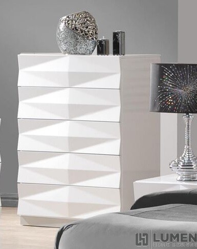 From our Carnegie Bedroom set, this timeless bed borrows from classic design lines for a sophisticated and comfy look. The matching headboard features solid wood construction with plush foam padding and tufting for extra comfort while relaxing in bed. Its strong wooden base requires no extra box spring for holding your mattress. As with the rest of our Carnegie Set, this bed was crafted using high quality woods, lacquers and fabrics. Take your pick: it comes in King, Queen and Full size. Matching dresser, chest and nightstands are also available. Essentials about this piece: Expertly crafted using solid wood veneers and premium leatherette. Some assembly required. Color scheme: White, high gloss. Dimensions: King - 43" H x 84" L x 96" D. Dimensions: Queen - 43" H x 84" L x 73" D. Dimensions: Full - 43" H x 79" L x 63" D. Other pieces in this set sold separately.