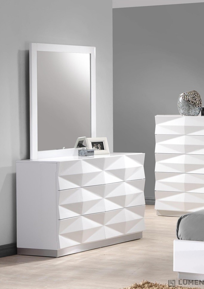 From our Carnegie Bedroom set, classic meets modern cool in this nightstand. It features a traditional two drawer shape, roomy enough to discreetly store all of your bedside essentials. Geometric molding on the outside of the drawers give this piece visual interest and make it fight right into contemporary settings. Our Carnegie nightstand was crafted using premium solid woods and natural lacquers. Matching bed, chest and dresser are also available. Essentials about this piece: Expertly crafted using solid wood veneers. Premium soft closing tracks. No assembly required. Color scheme: White, high gloss. Dimensions: 19" H x 16" L x 21" D. Other pieces in this set sold separately.