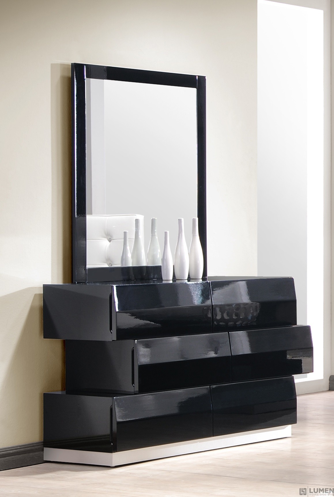 Short Description From our High Line Bedroom set, this asymmetrical nightstand is both unique and highly functional. It features two ample drawers for storing all of your bedtime necessities. Its tabletop comes split into two levels for added visual interest, allowing you to neatly add a variety of decorative items or even an alarm clock. Our High Line nightstand was expertly made using premium solid woods and natural lacquers. This piece comes in both Black or White lacquers to better suit your space. Matching bed, chest, mirror and dresser are also available. Essentials about this piece: Expertly crafted using solid wood veneers and natural lacquers. Premium soft closing tracks. No assembly required. Color scheme: Black or White, high gloss. Dimensions: 19" H x 17" L x 21" D. Other pieces in this set sold separately.