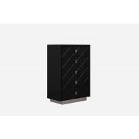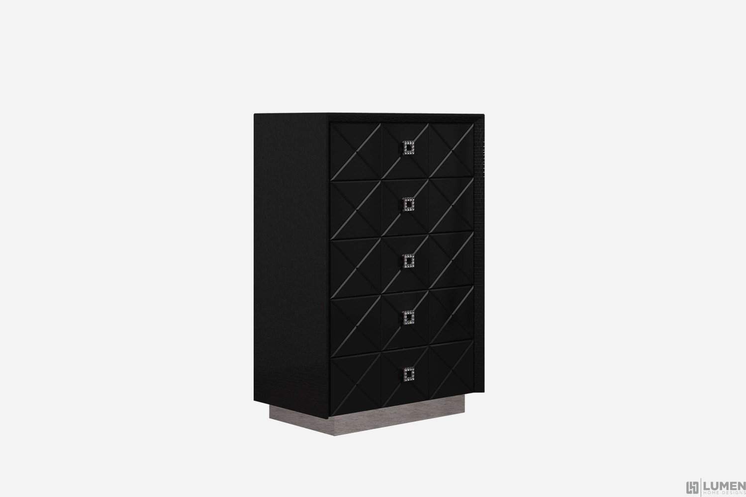 Short Description Keeping with a midnight theme, Lumen Home Designs introduces the Zara bedroom set, available in either king or queen. All 5 pieces rest upon shiny chrome stainless steel supports while the Zara’s beveled design has an added touch of crocodile patterned eco-leather which makes it way through the bed, nightstands, dresser and chest. Also included is the mirror. Amidst the crocodile patterned design are authentic Swarovski crystals which outline the handles on this stunning set from Lumen Home Designs.MDF Eco-Leather Chromed Stainless Steel Swarovski Crystals