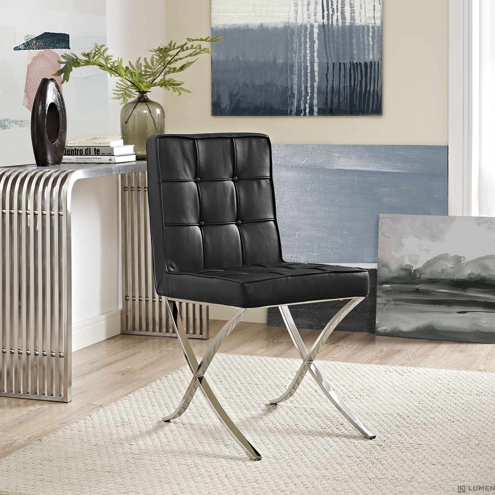 Short Description Modern Lounge Chair Padded Vinyl Seat and Back Polished Stainless Steel Frame Easy Wipe Clean Surface Non-Marking Foot Pads Assembly Required
