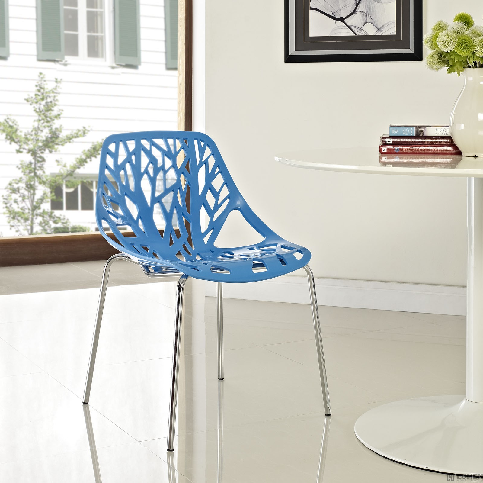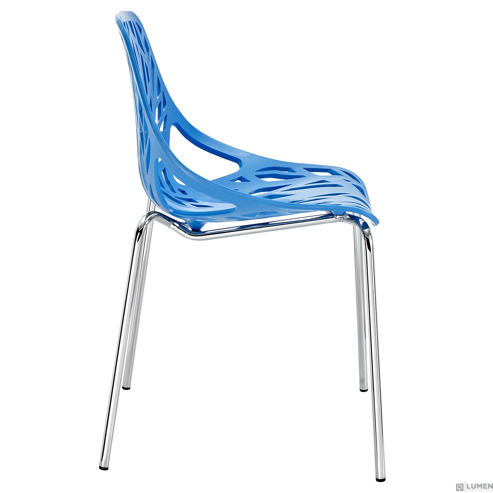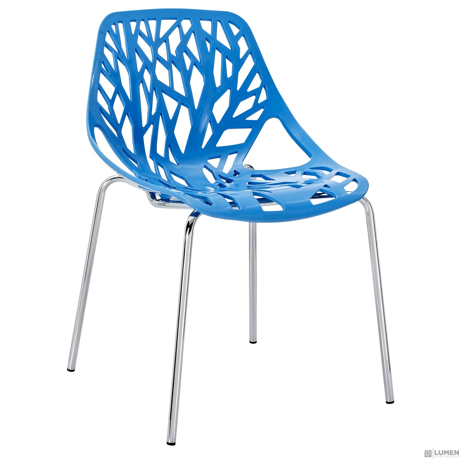 Organic leafy forest motif Either indoor or outdoor use Modern dining or accent chair Chrome plated steel base Molded plastic seat Stackable Weight Capacity: 330 Pounds