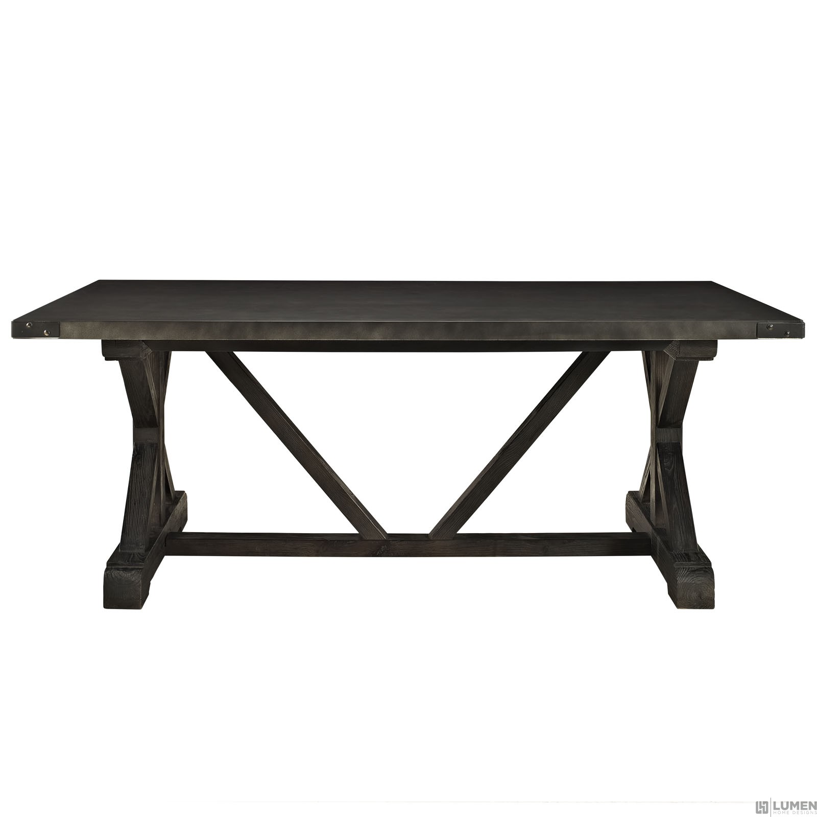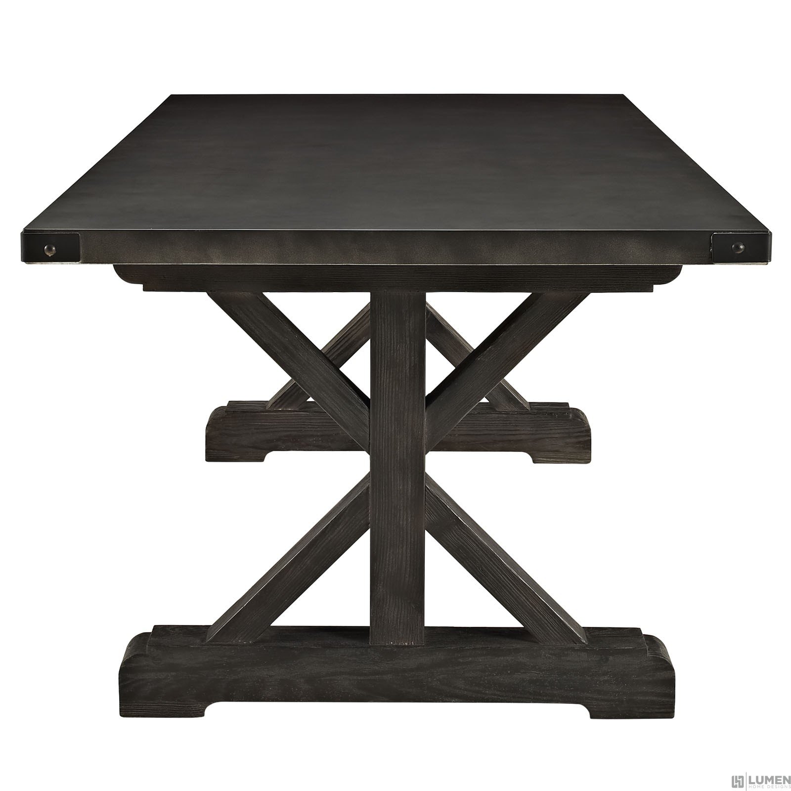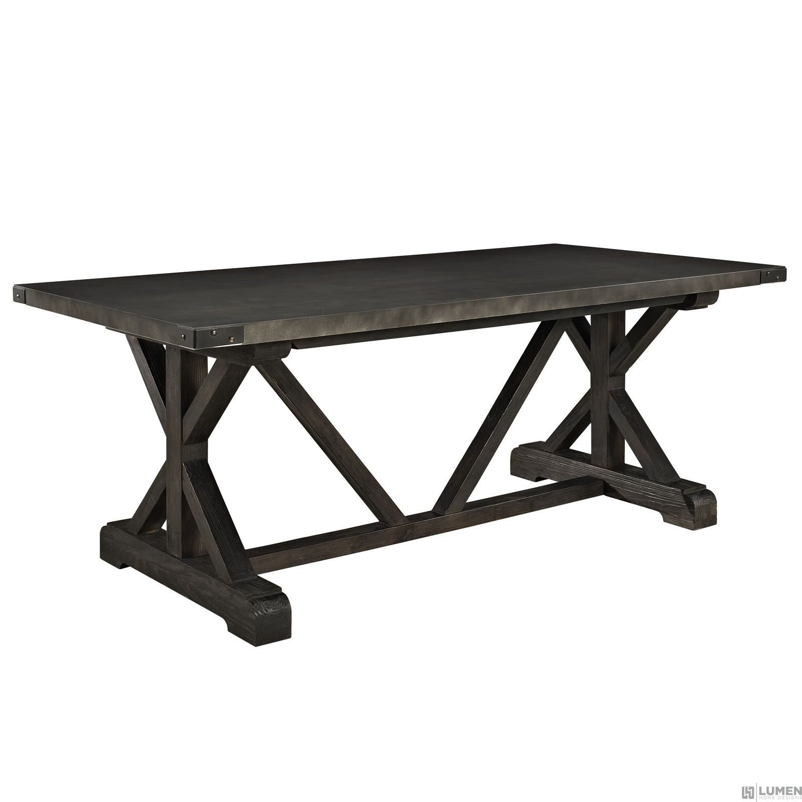 Modern dining table MDF fiberboard top (stained but not sealed) Top covered in metal sheet Pine wood base