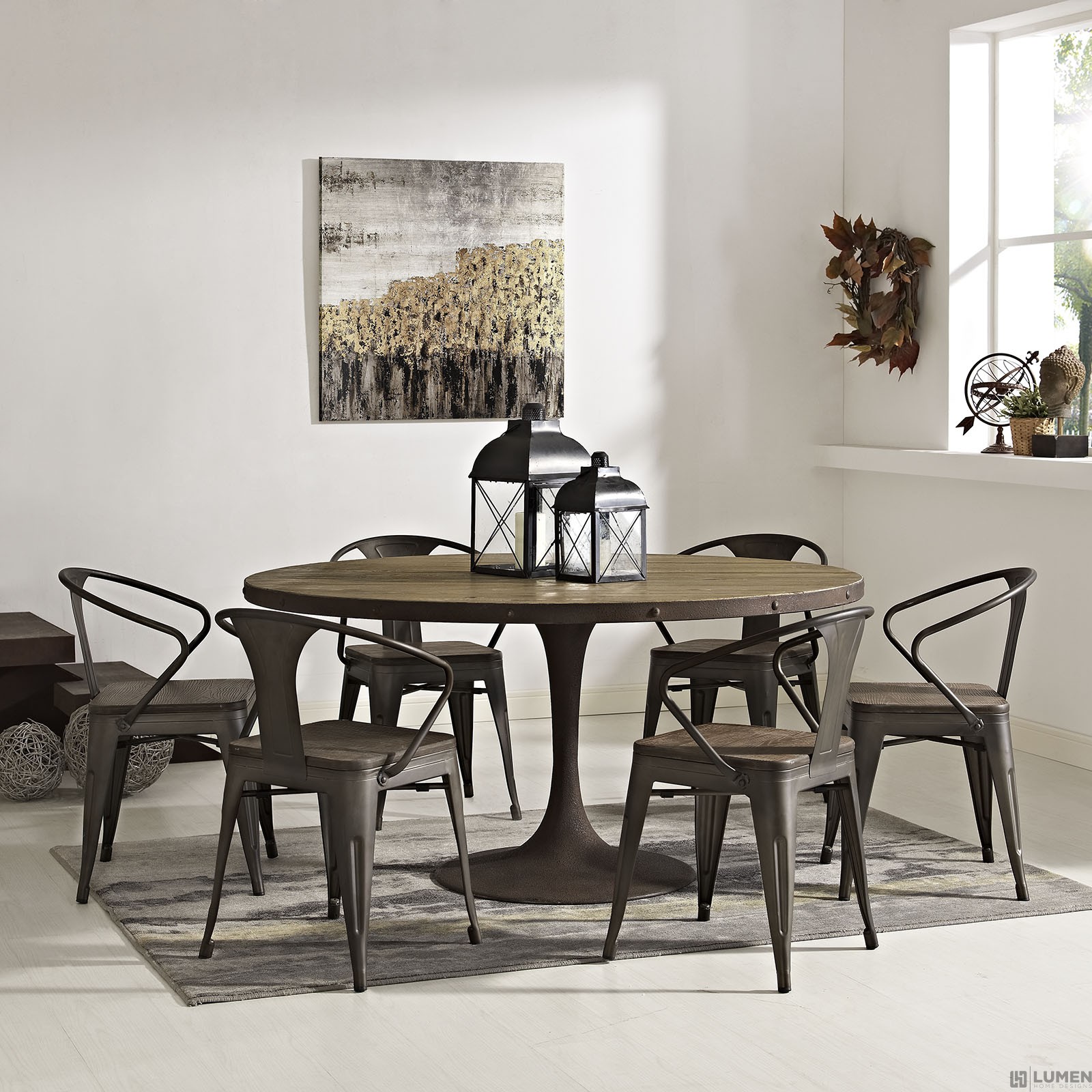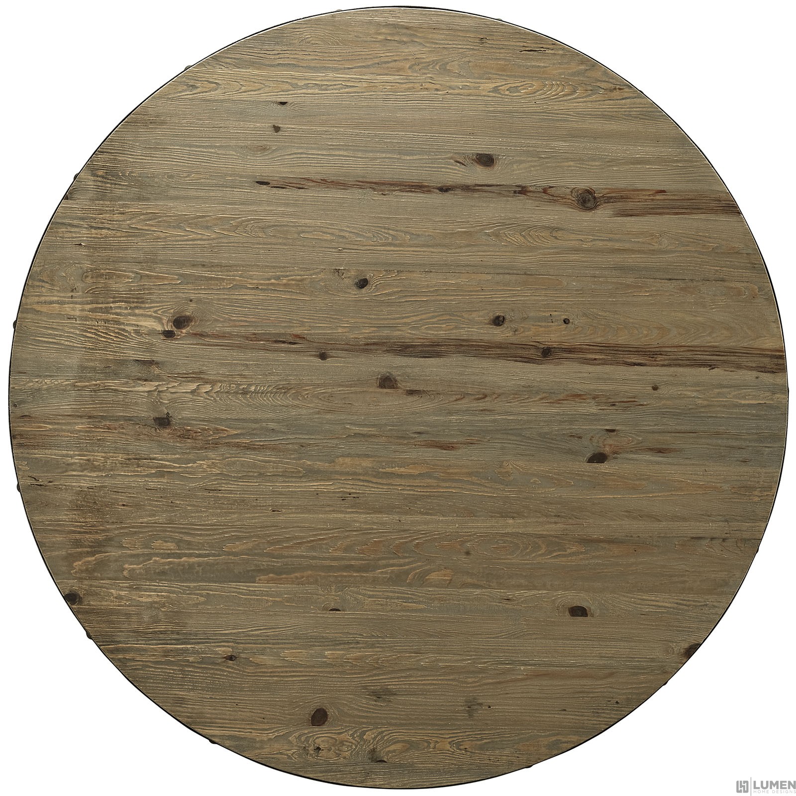 Short Description Industrial Modern Dining Table Pine Wood Top with Iron Rim Stained But Not Sealed Wood Cast Iron Pedestal Base Non-Marking Floor Pads