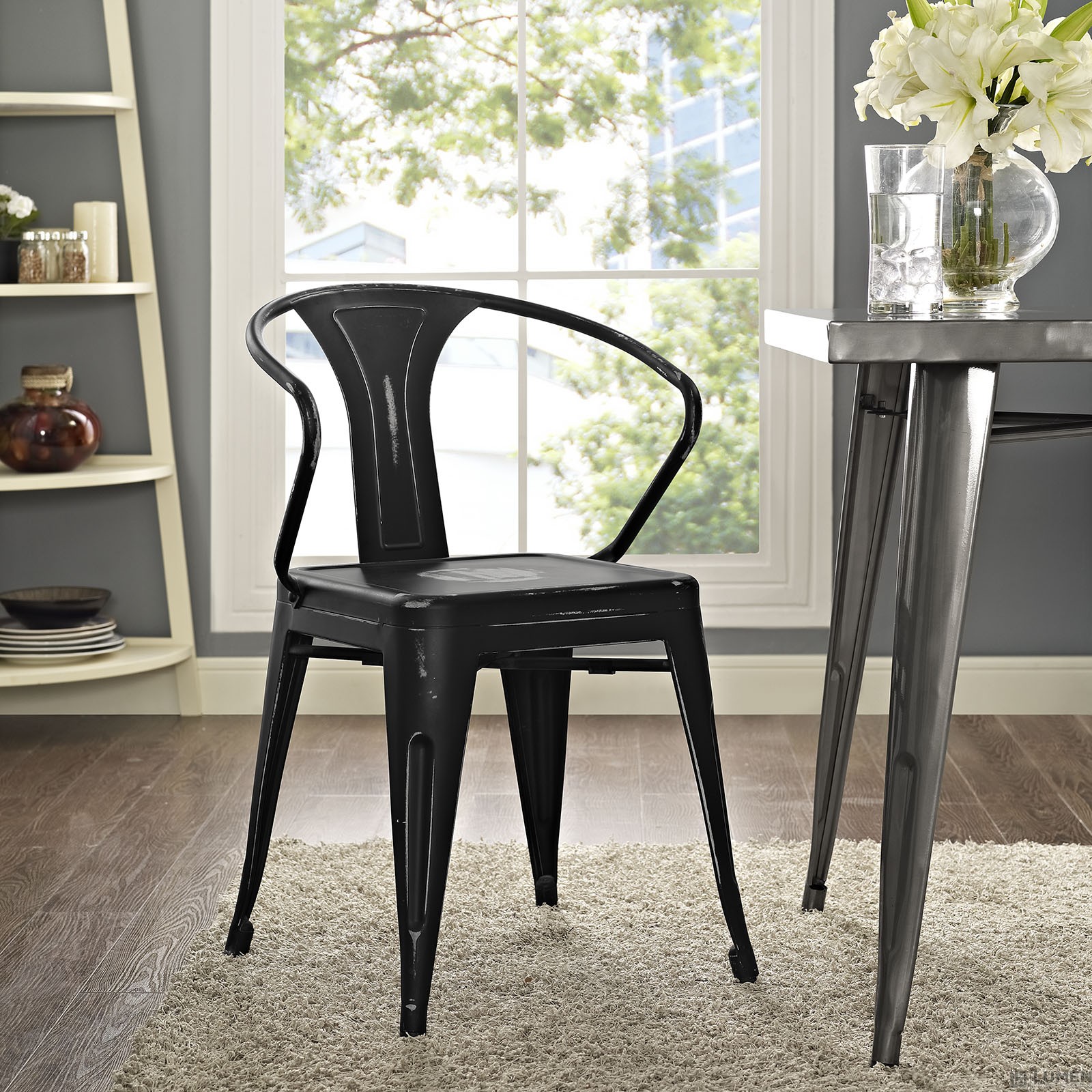 Short Description Modern Dining Arm Chair Power Coated Steel Distressed Finish Some Assembly Required Non-Marking Feet Caps