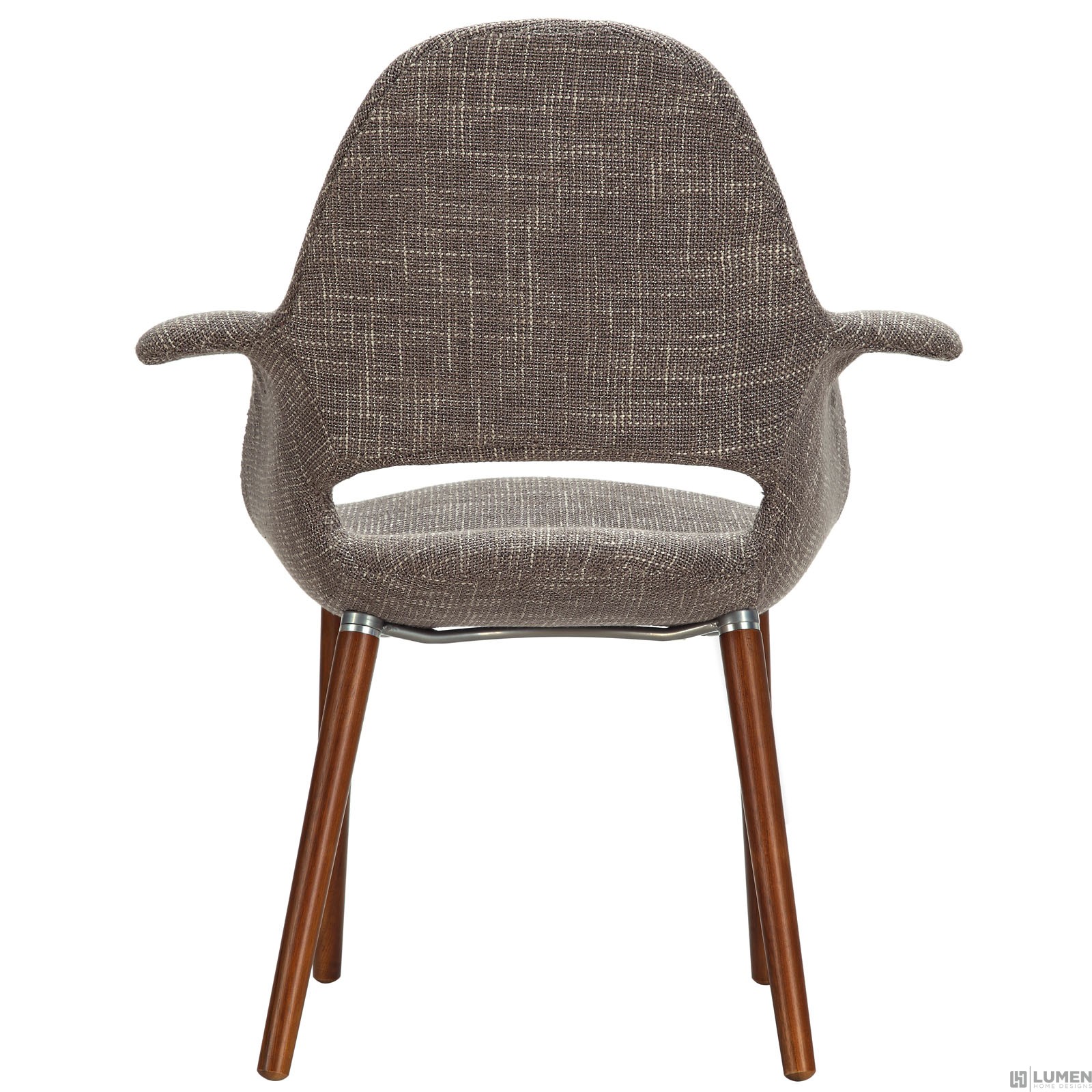 Short Description Mid-century design with a modern look Supportive high back and arms Foam padding for comfort Medium brown wooden legs Patterned twill fabric Finely upholstered fabric Assembly required Chair weight capacity - 310 lbs.