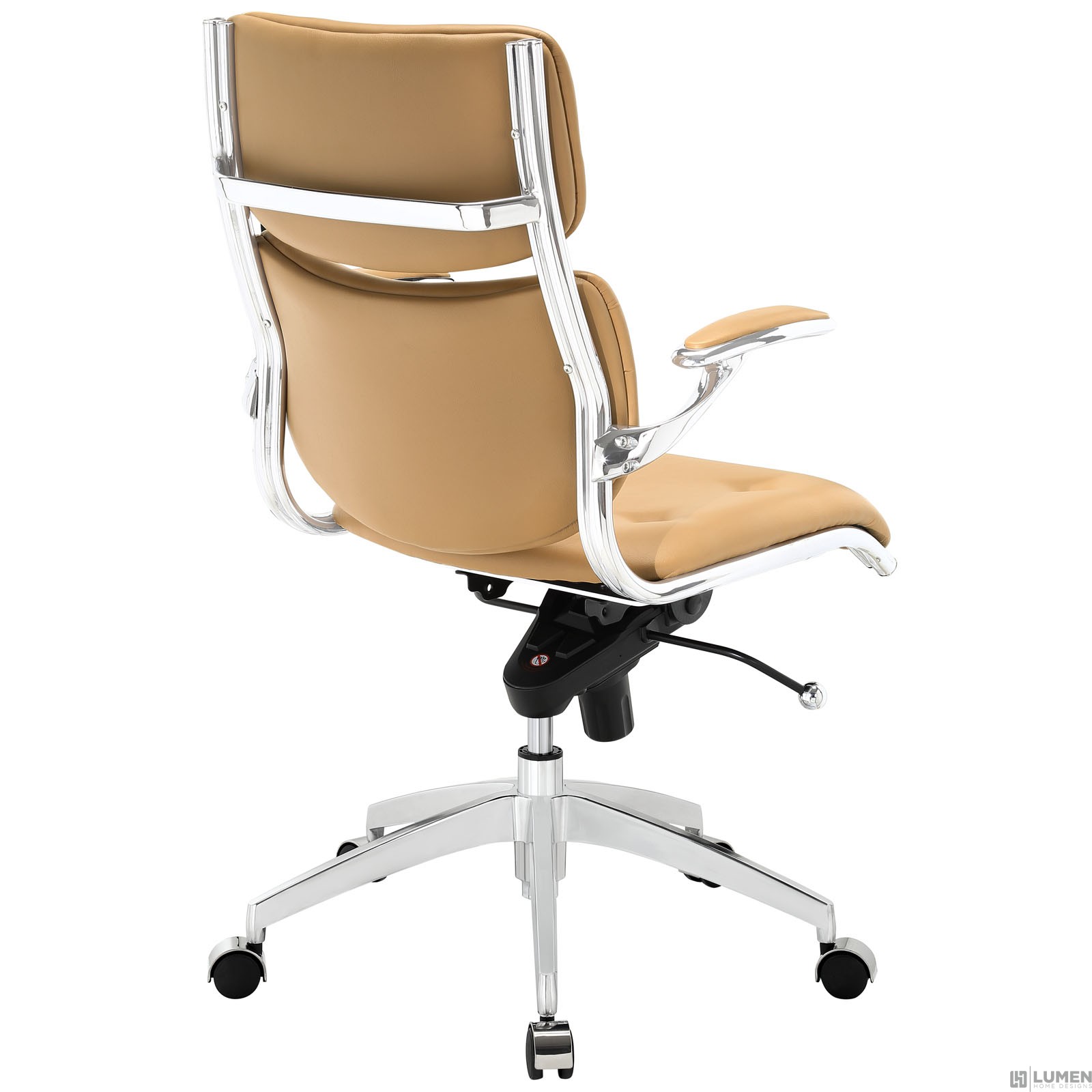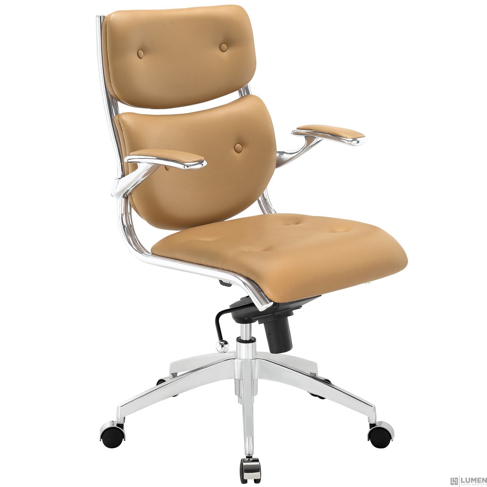 Short Description Five dual-casters for easy gliding Tension knob for tilt control Pneumatic height adjustment "Chrome metal frame, padded armrests" 360 degree swivel Buttoned leatherette padding Waterfall seat Assembly Required