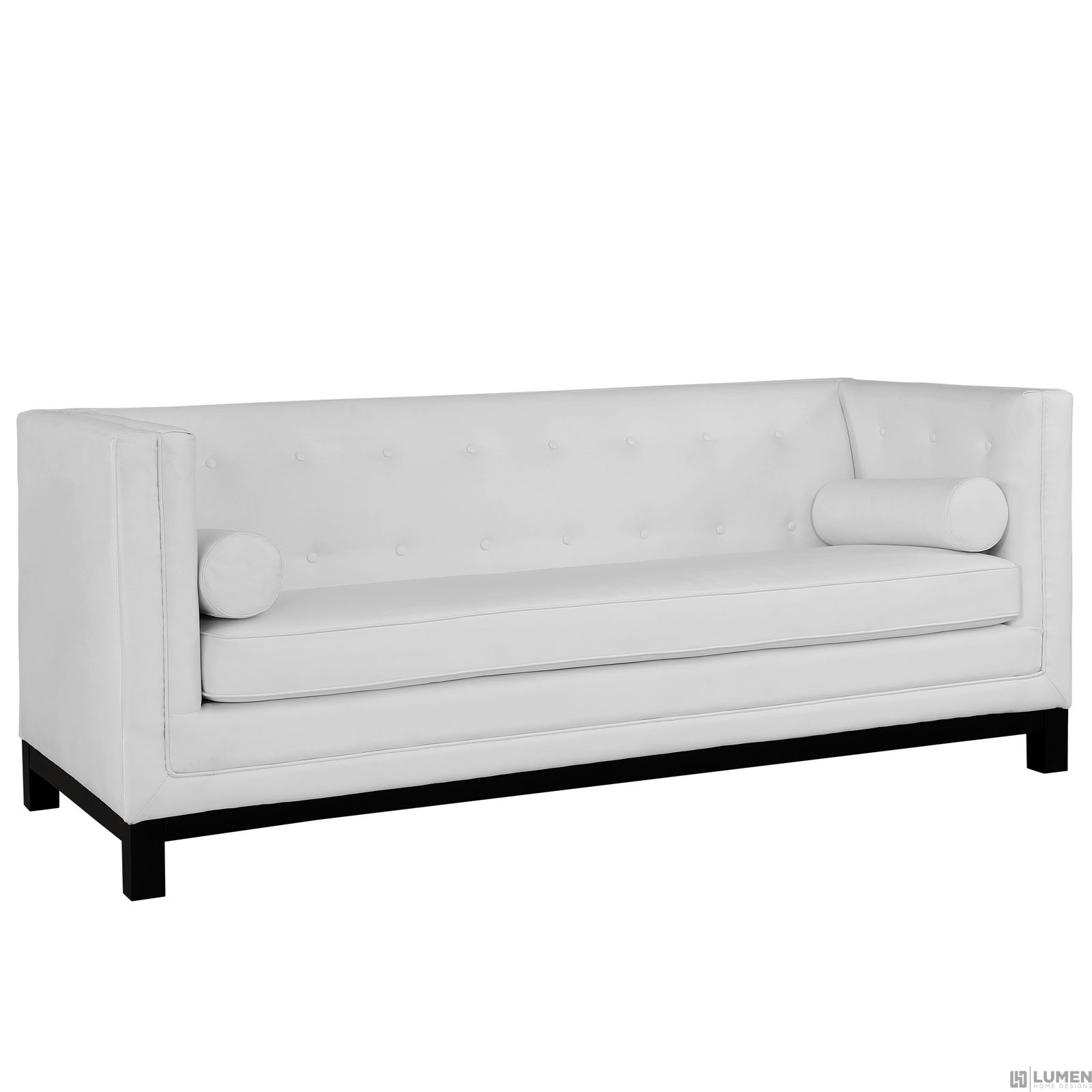 Mid-century modern style Bonded Leather Upholestry Solid wood frame Wipe clean surface Tufted buttons Side support pillows