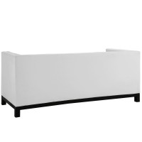 Short Description Mid-century modern style Bonded Leather Upholestry Solid wood frame Wipe clean surface Tufted buttons Side support pillows