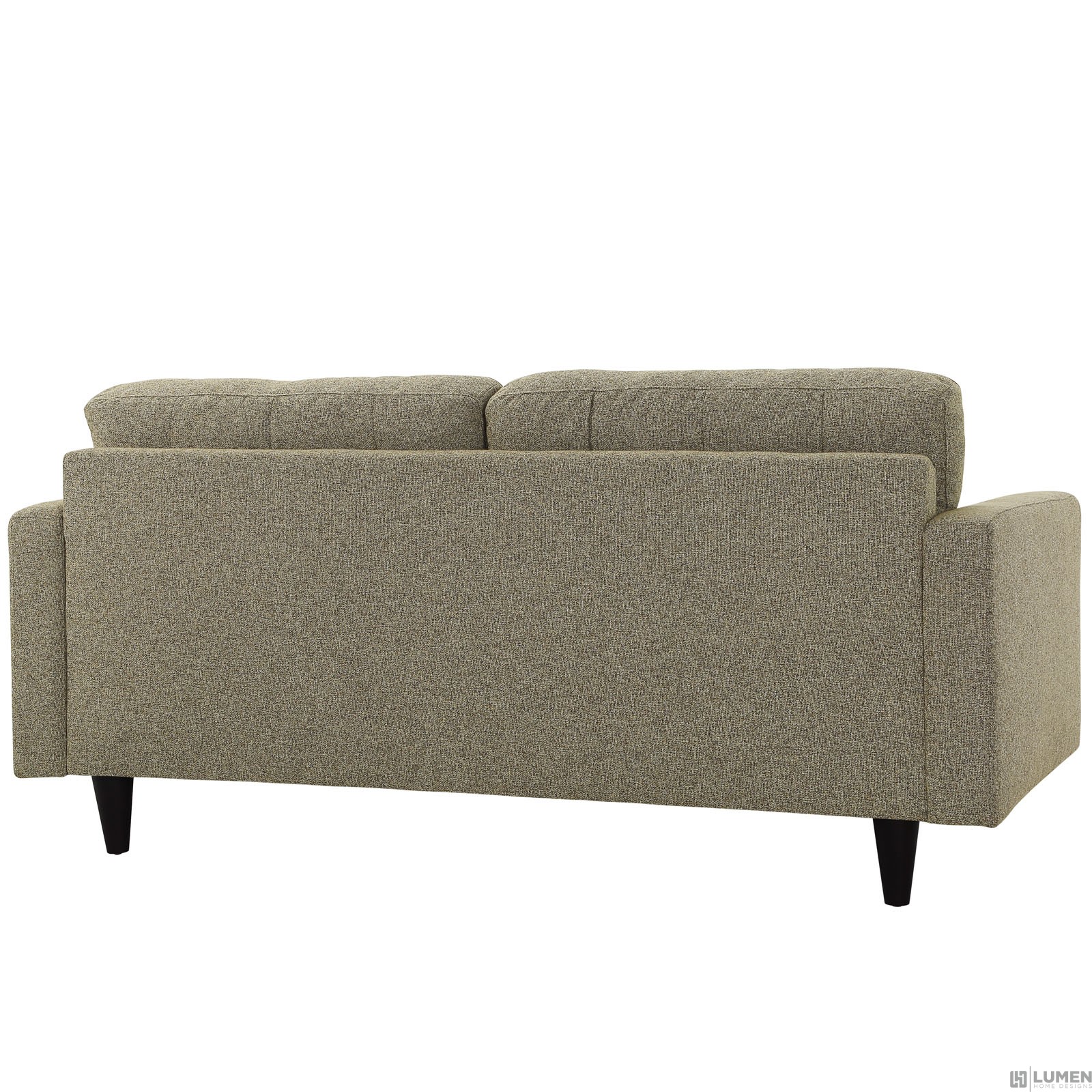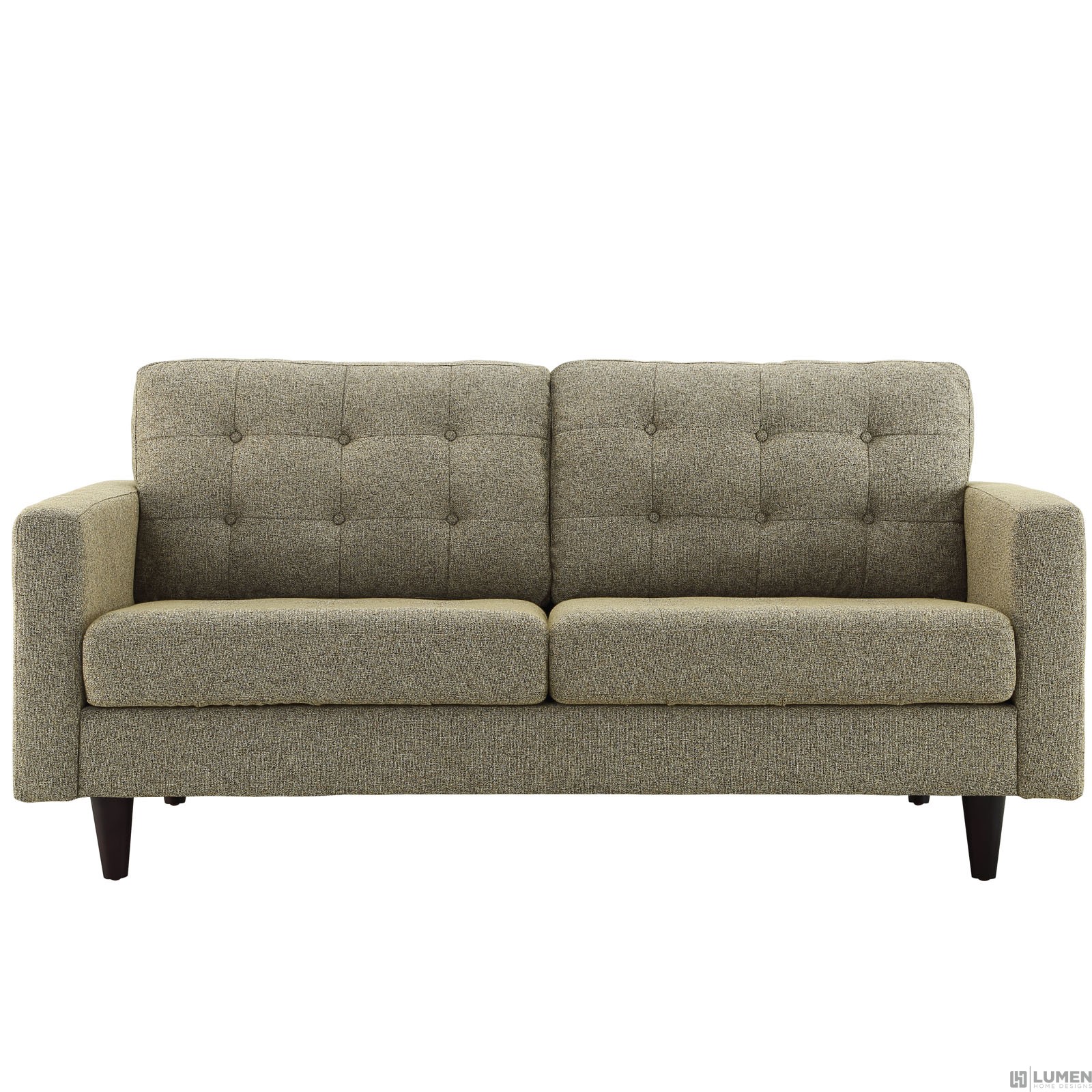 Modern loveseat Deeply tufted buttons Fine polyester upholstery Plastic foot glides Solid rubberwood legs Spot clean only Some assembly required
