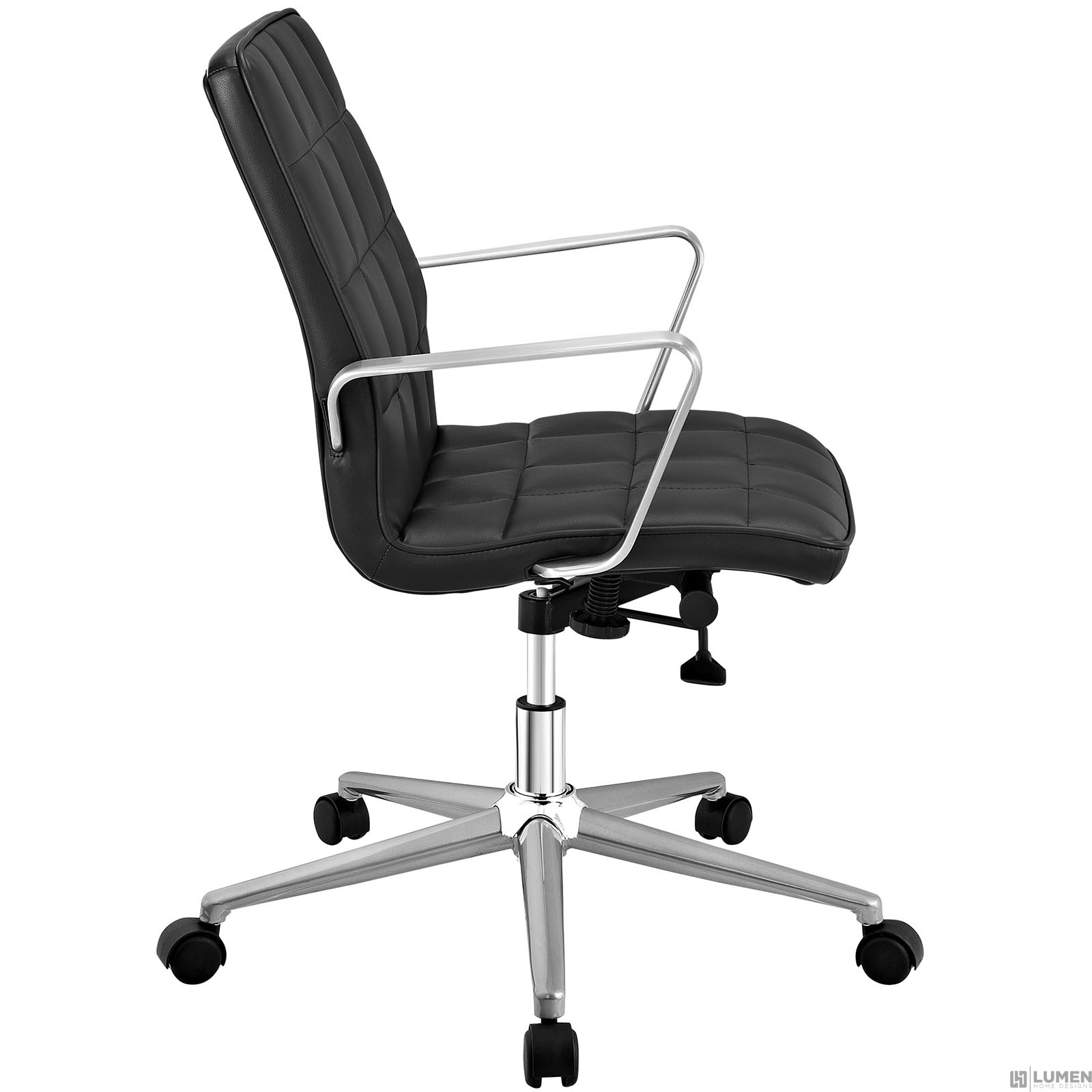 Short Description Brushed Aluminum Armrests Polished Steel Base Padded Vinyl Upholstery Five Dual-Wheel Nylon Casters "Height Adjustable, Full Swivel" Chair Weight Capacity: 331 lbs. Tension Knob / Assembly Required
