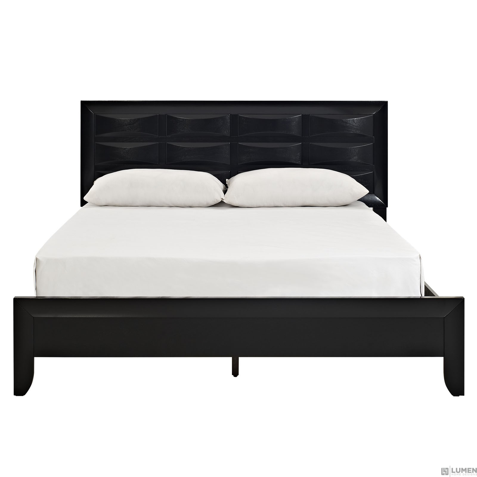 Contemporary bedroom furniture series Charcoal veneer with antique staining Solid wood frame with checkered headboard Does not include a mattress or box spring Wipe clean with dry cloth Assembly required Box Spring is required