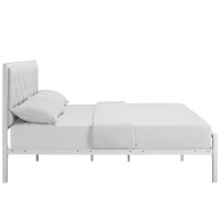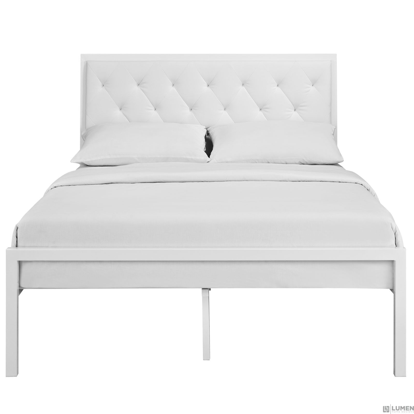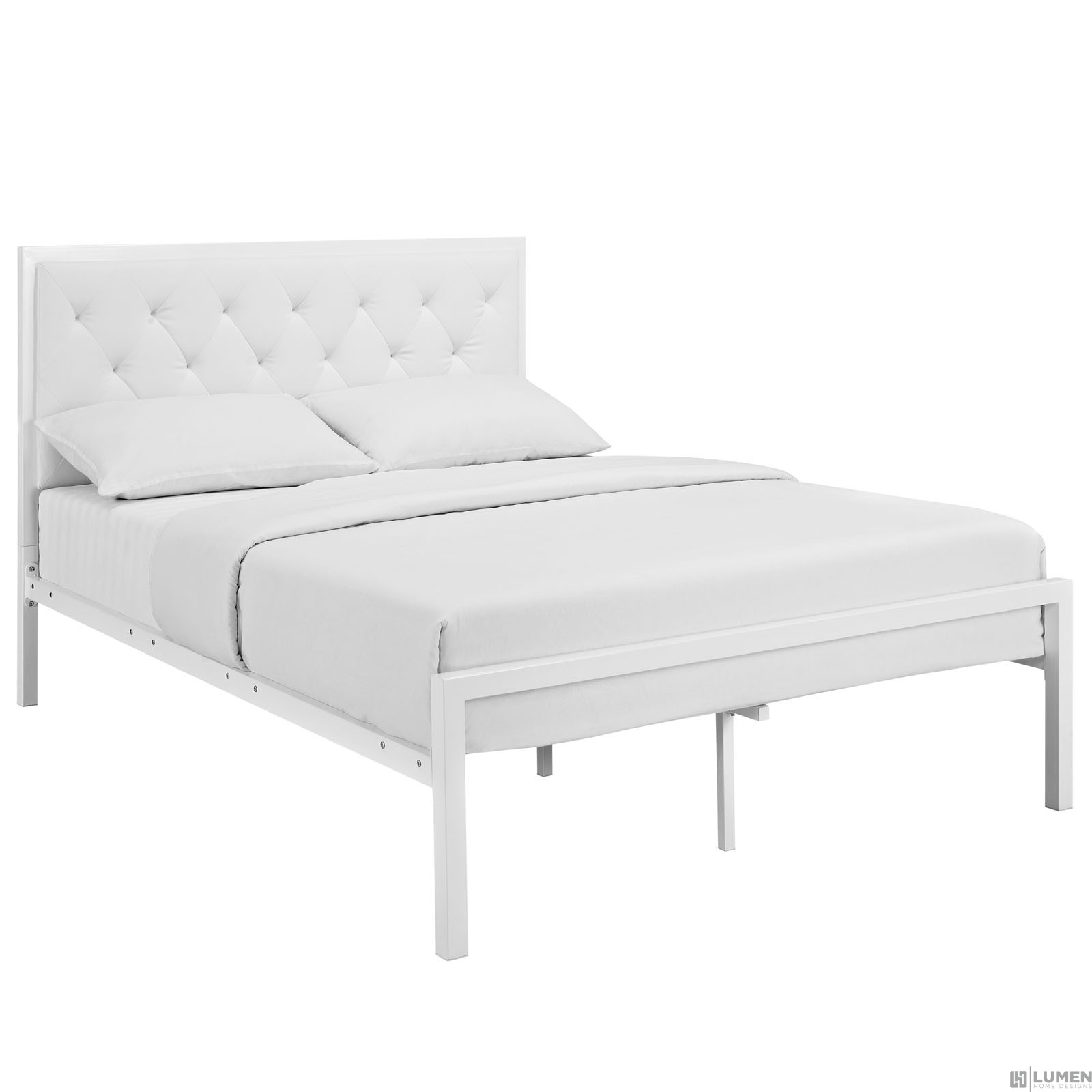 Platform bed frame with headboard Steel rod mattress support system Tufted button fabric headboard Power coated steel frame Does not require a box spring Assembly required Weight Capacity: 441 Pounds