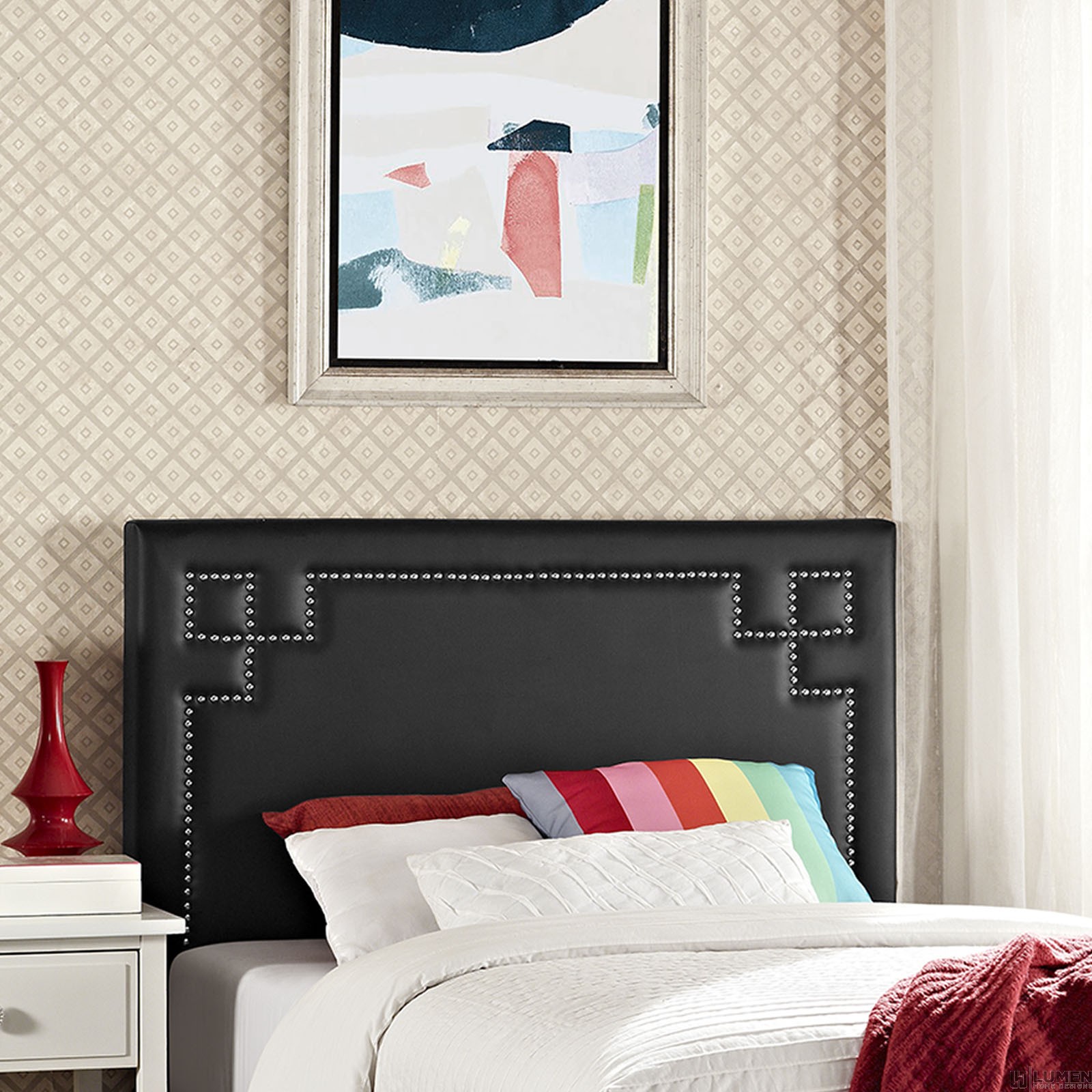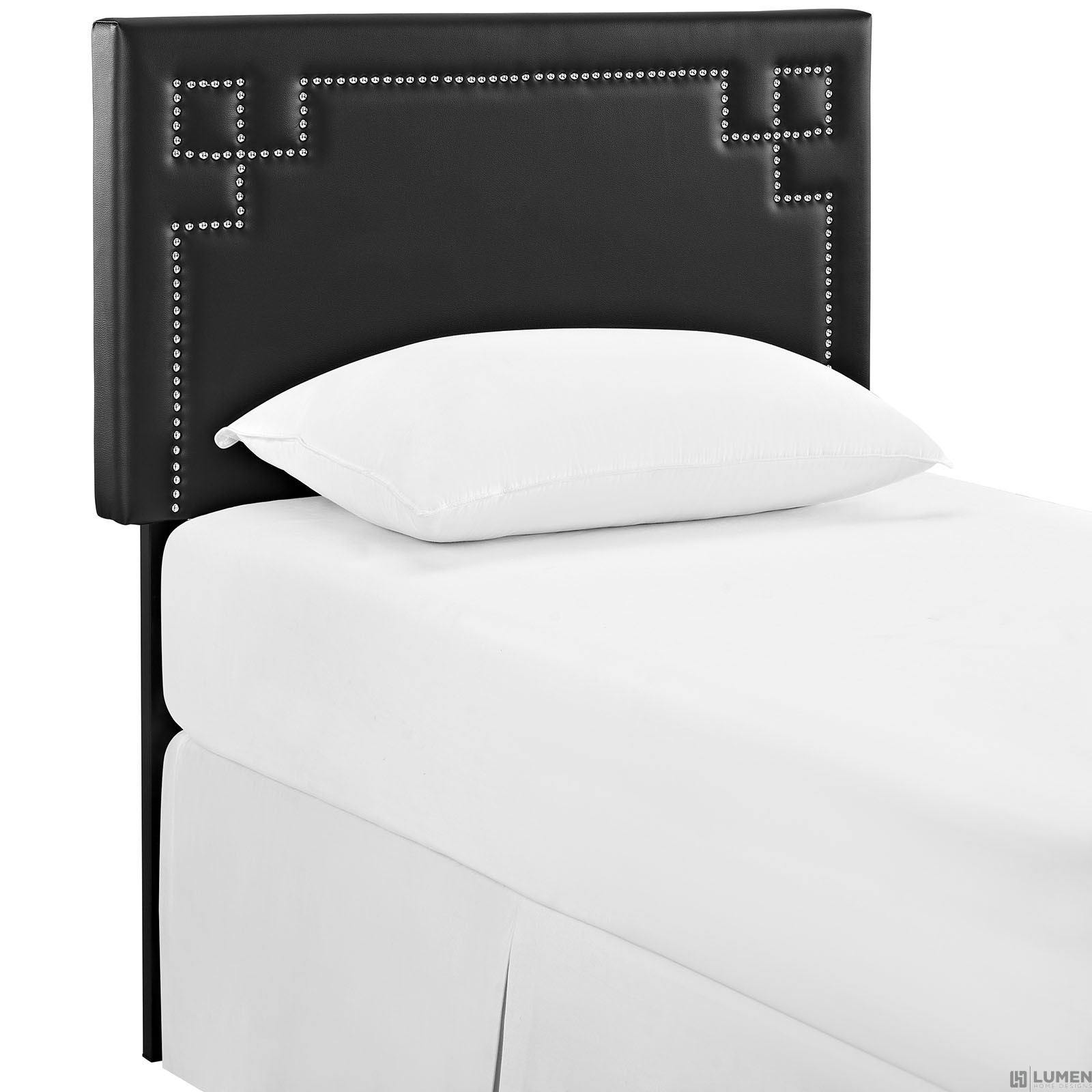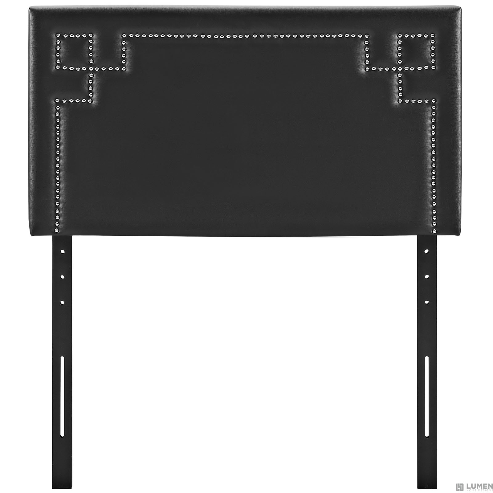 Short Description Fine Vinyl Upholstery Silver Accent Copper Buttons Solid Wood Frame Particleboard Panel Dense Foam Padding Mounts in Four Locations Assembly Required