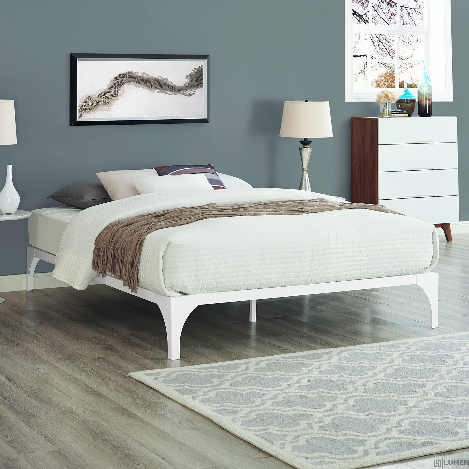 Short Description Modern Platform Bed Frame Sturdy Powder Coated Steel Frame Slatted Poplar Wood Support System Weight Capacity Up To 1300 lbs Non-Marking Foot Pads Assembly Required