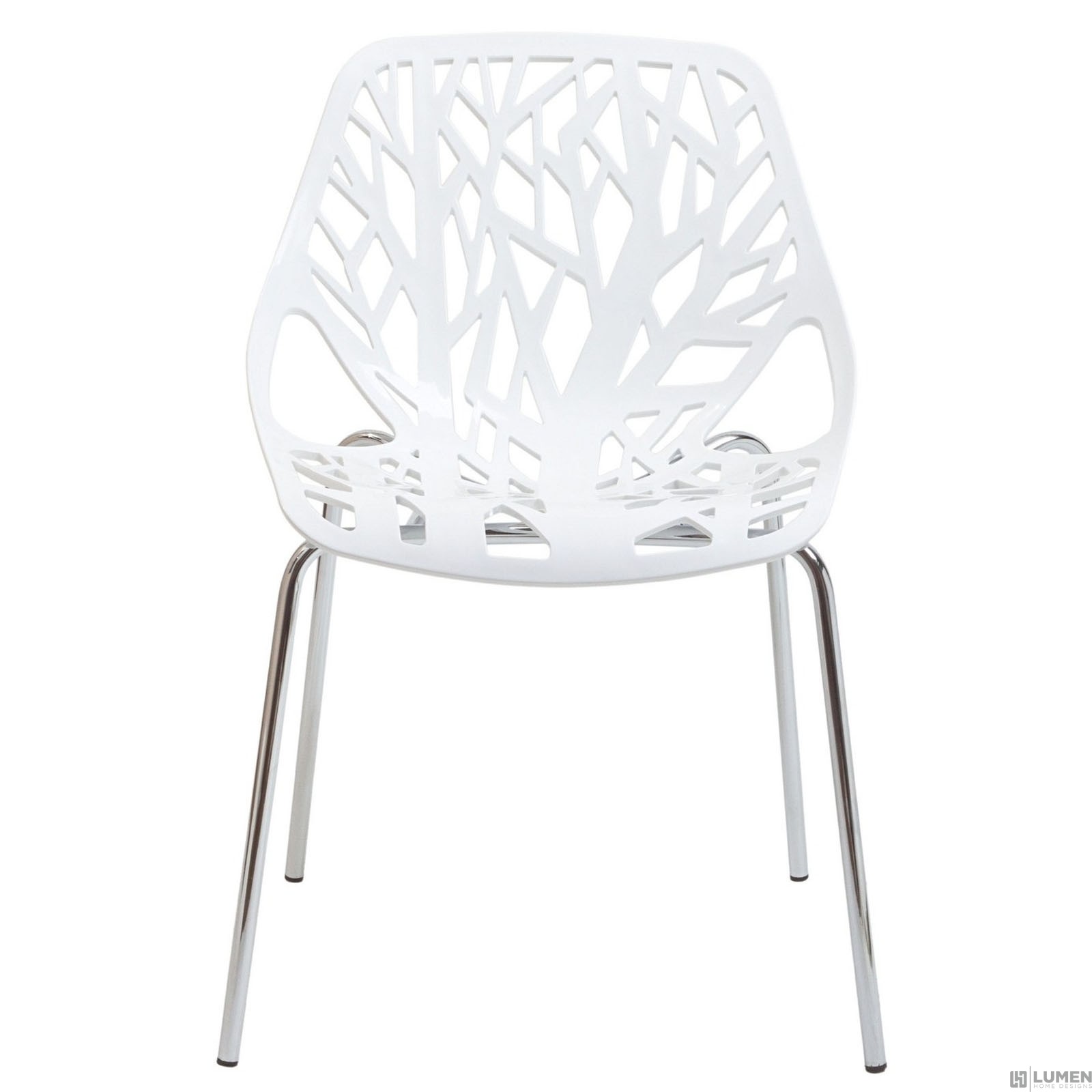 Organic leafy forest motif Either indoor or outdoor use Modern dining or accent chair Chrome plated steel base Molded plastic seat Stackable Weight Capacity: 330 Pounds