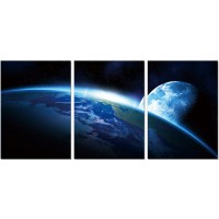 Short Description In nature, few connections are stronger than that between The Moon and The Earth. Pictured here in rich hues of blue and black, the moon can be seen in her dramatic daily dance around our planet. Bring this 3 print set into your favorite room to inspire you and bring you tranquility every day. And remember this: Sky above, Earth below and Peace within. This timeless 3-panel art set will look best as an accent to any modern and contemporary décor scheme, especially offices, studios and family rooms. Essentials about this piece: • Expertly made using state of the art printing onto acrylic. • Unframed, ready to hang. • Color scheme: Blue and black. • Dimensions: 3-piece set, each 27.5” W x 19.6” H.