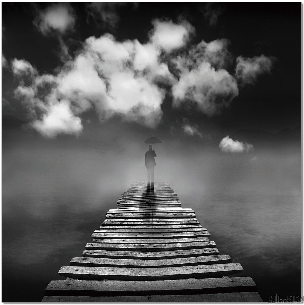 Short Description If you could know what lies ahead in your life, would you like to be told? The motif of an uncertain future is photographed here in abstract black and white. Our mystery man has covered a long way, and now stands surrounded by fog to represent the unknown. Armed with an umbrella, in case things become real unsteady, he confidently looks on. This single black and white print of a man will look best in enclosed spaces in need of a touch of mystery and inspiration. Essentials about this piece: • Expertly made using state of the art printing onto acrylic. • Unframed, ready to hang. • Color scheme: Black and white. • Dimensions: One piece, 47” H x 47” W.
