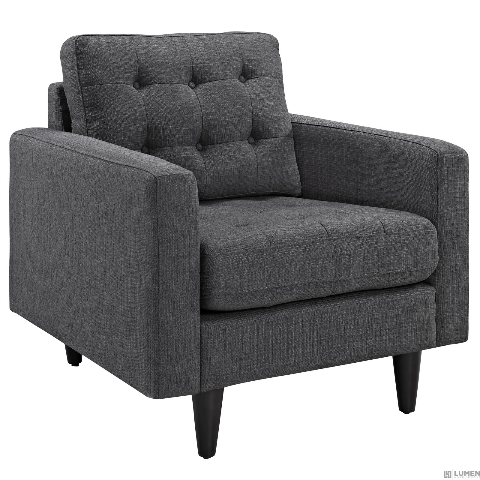 Modern armchair Deeply tufted buttons Polyester upholstery Solid wooden legs Glides to prevent scratching
