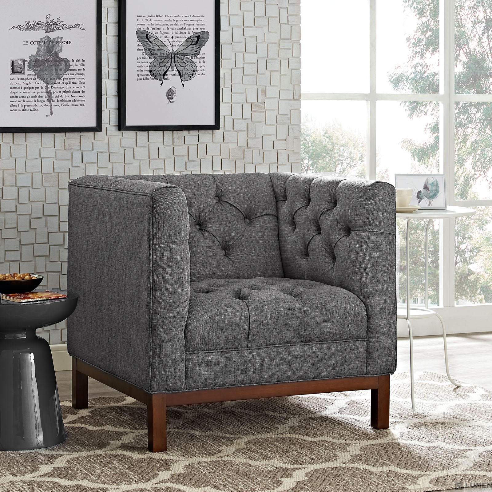 Short Description Walnut Stained Beech Wood Legs Plastic Floor Glides Finely Upholstered Fabric Armchair Weight Capacity - 441