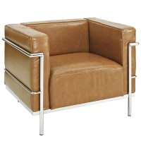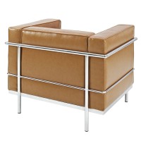 Short Description Mid-Century Modern Armchair Genuine Leather Seating Surface Tubular Stainless Steel Frame Foot caps to prevent scratching